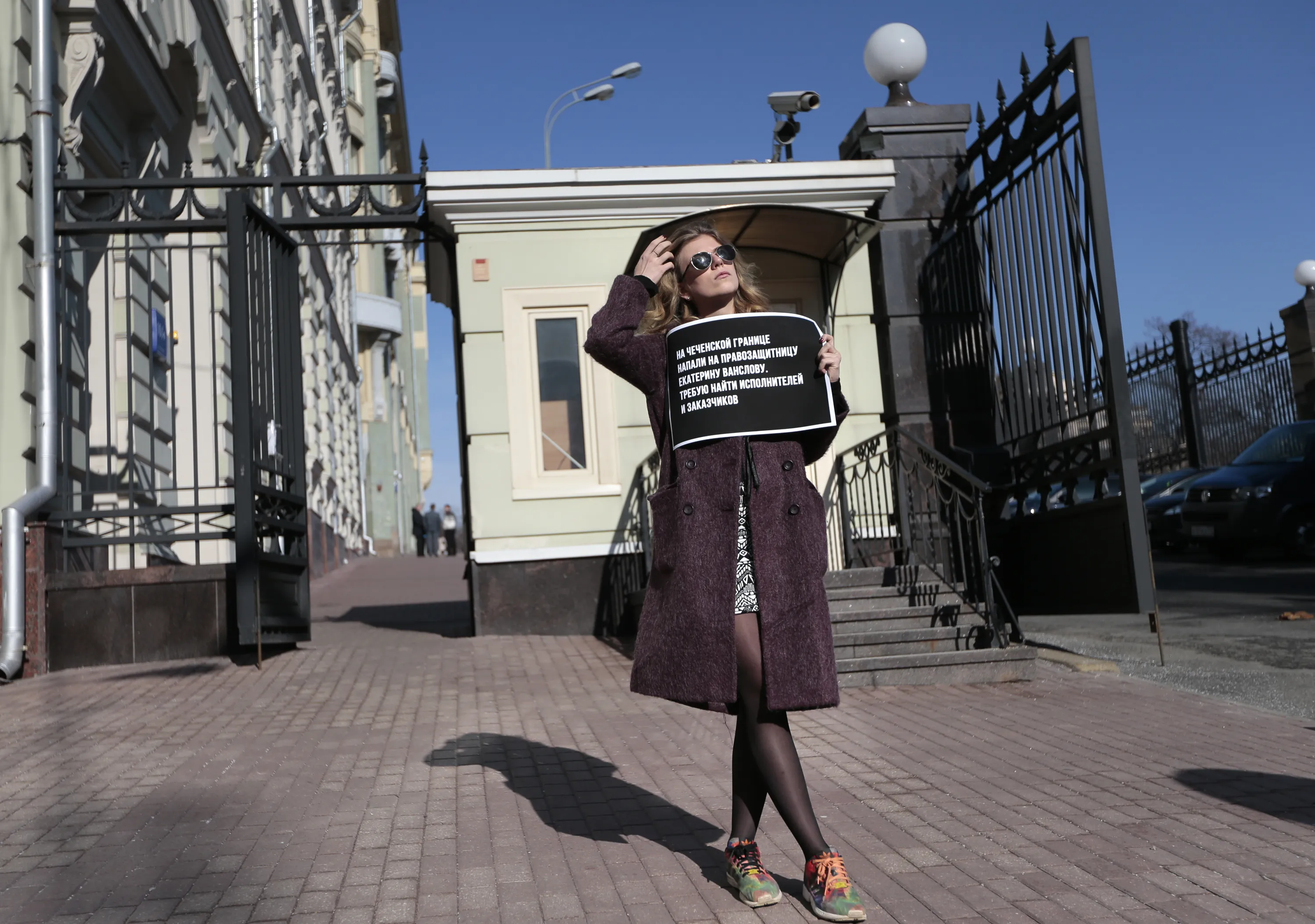 A human rights activist holds a poster as she pickets Russian President's Administration building in Moscow, Russia on Thursday, March 10. 2016. The Committee to Protect Journalists is blaming Russian authorities’ inattention to anti-media hostility as enabling the attack near Chechnya that left six journalists injured. The CPJ’s statement Thursday came a day after attackers intercepted a small bus carrying activists and journalists, beat them and set the vehicle afire. The poster reads: Human rights activist Yekaterina Vanslova was attacked at Chechen border, I demand that attackers and organizers should be found. (Photo by Ivan Sekretarev/AP Photo)