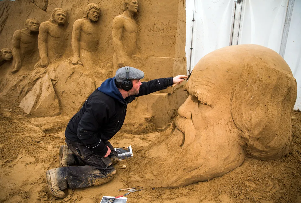 Ferenc Monostori from Hungary is working on the head of Charles Darwin at the sand sculpture show in Binz on Ruegen island, Germany, Wednesday, March 9, 2016. With the motto 'Fascination Nature', 50 sand artists create sand sculptures that lead to the five continents of planet Earth. (Photo by Jens Buettner/DPA via AP Photo)