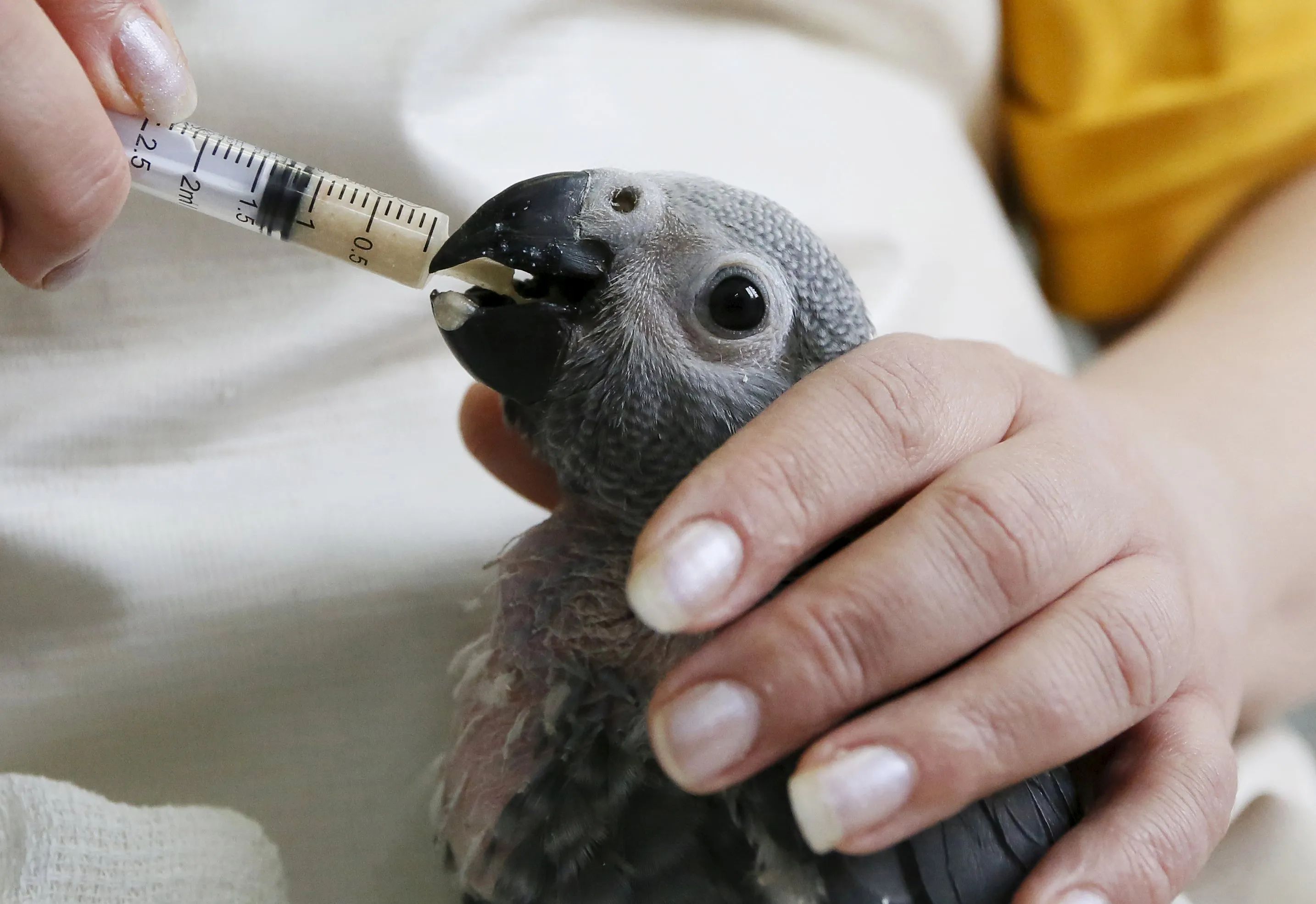 An employee feeds a one-month-old African grey parrot at the Royev Ruchey zoo in a surburb of Krasnoyarsk, Siberia, Russia, March 11, 2016. (Photo by Ilya Naymushin/Reuters)