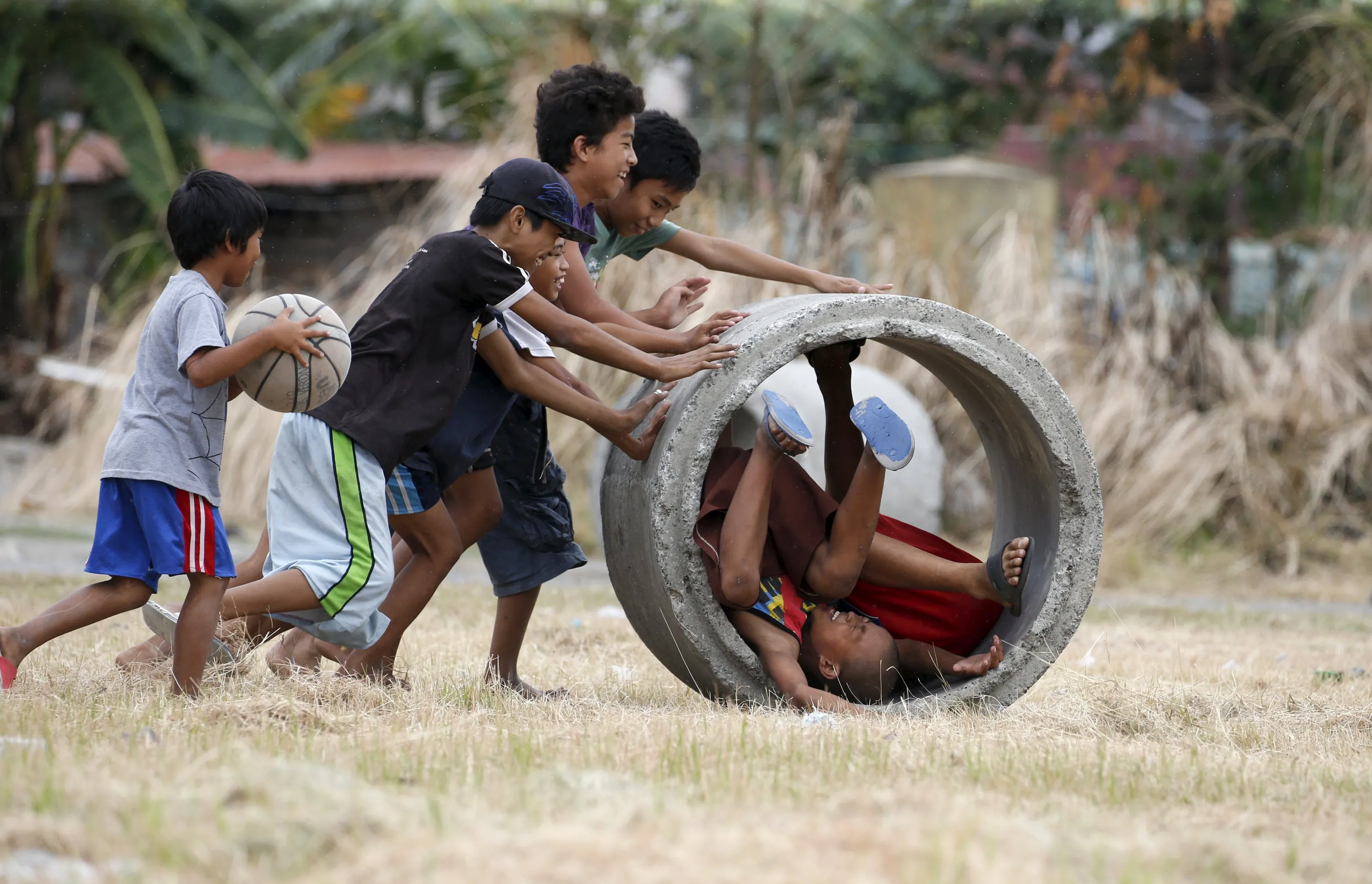 Boys play with a drainage culvert used for flood control in Las Pinas, Metro Manila February 28, 2016. (Photo by Erik De Castro/Reuters)