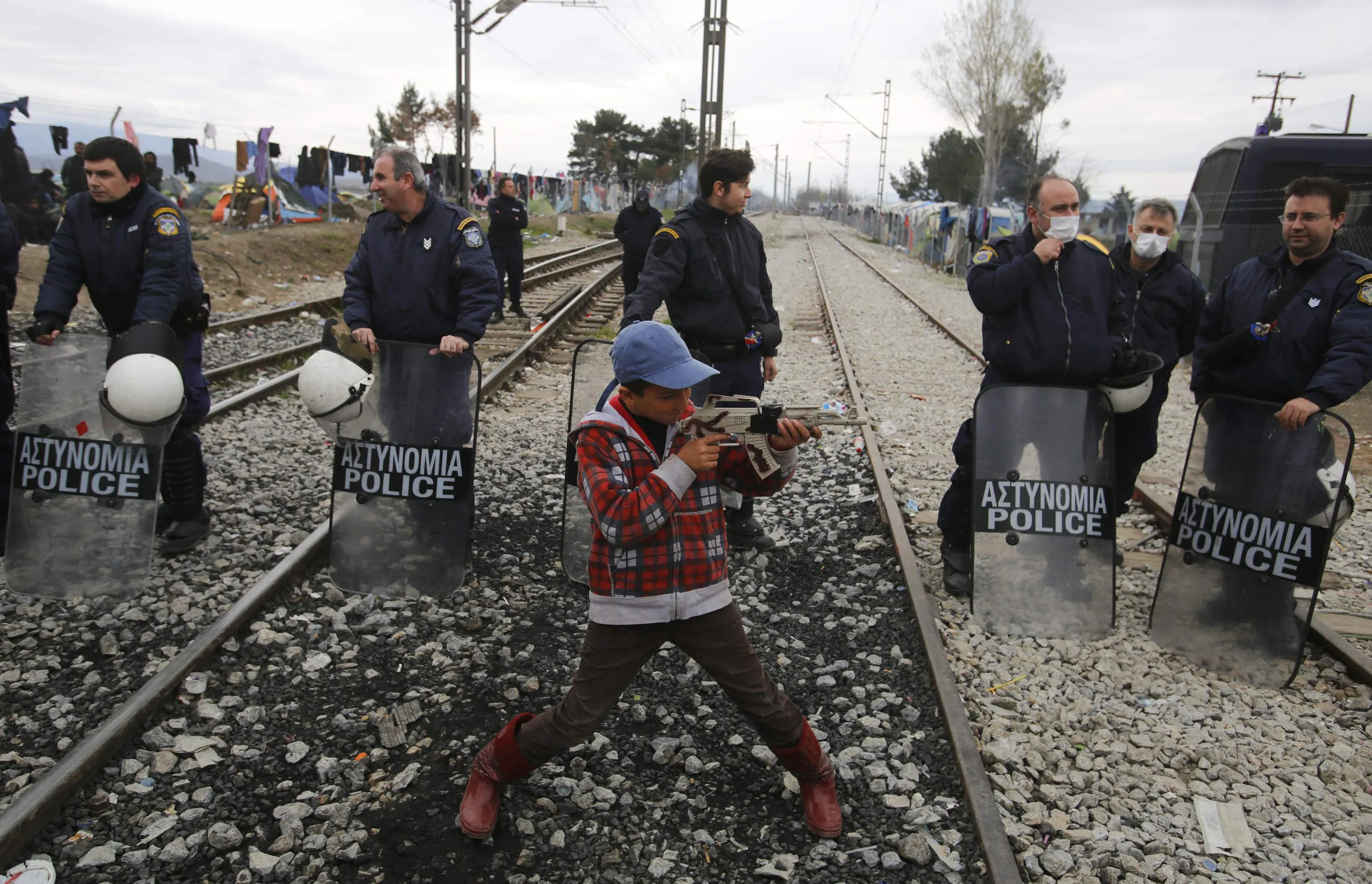 A boy plays with a toy gun in front of the policemen as other migrants block the railway track at the Greek-Macedonian border, near the village of Idomeni, Greece March 12, 2016. (Photo by Stoyan Nenov/Reuters)