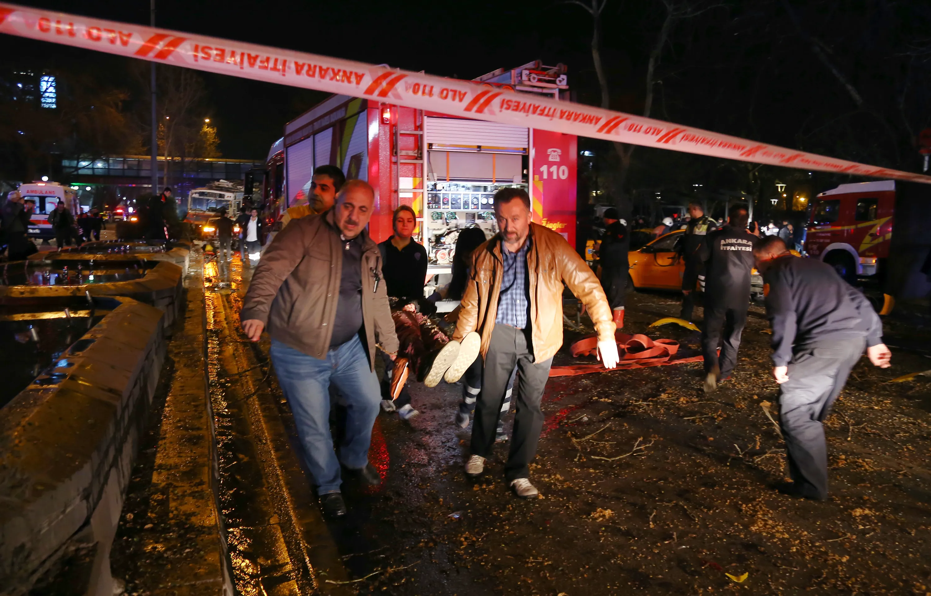 People carry an injured person after an explosion in the busy center of Turkish capital, Ankara, Turkey, Sunday, March 13, 2016. (Photo by AP Photo)