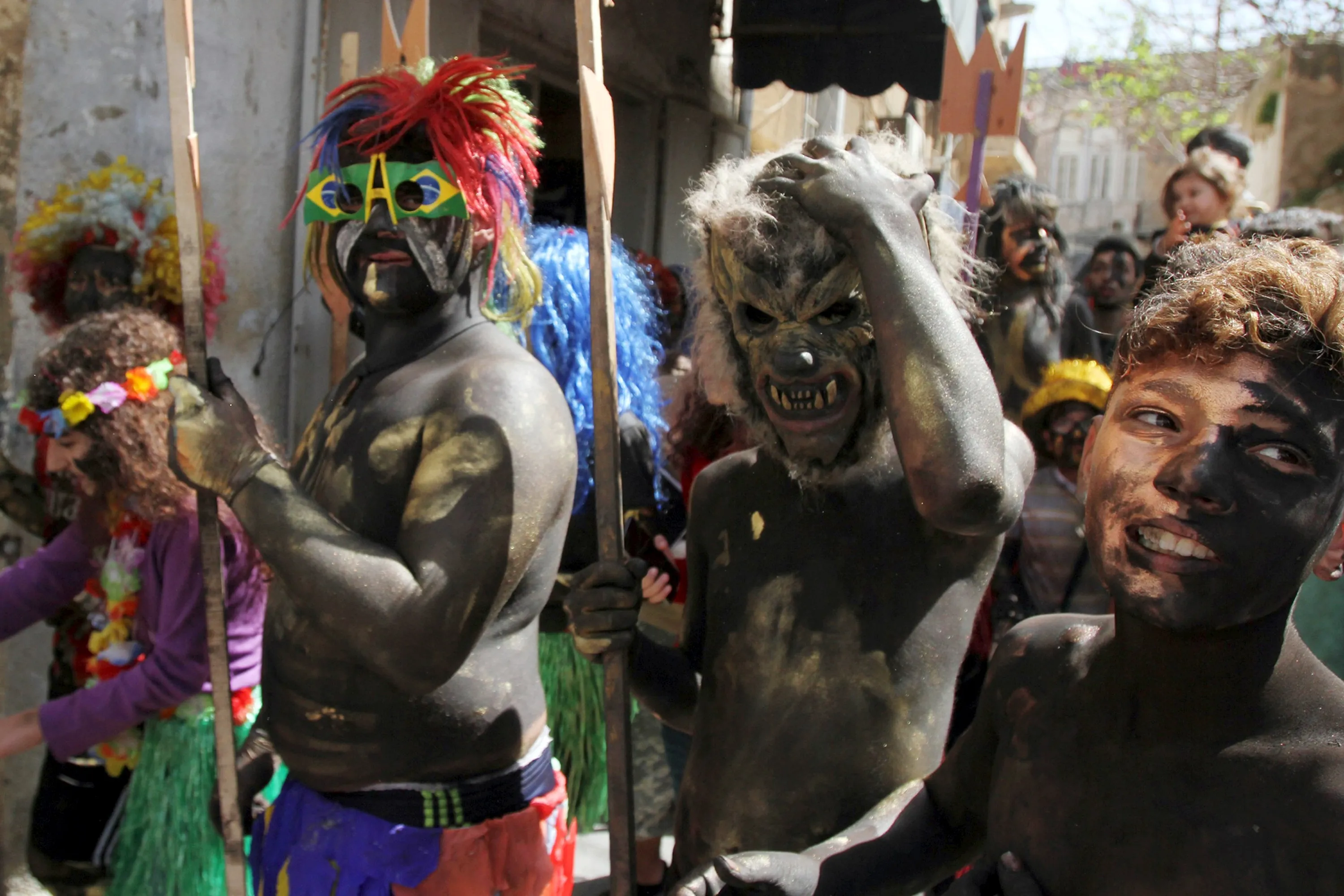 Residents perform during the annual Zambo carnival, in the coastal city of Tripoli, northern Lebanon March 13, 2016. Revellers would paint their bodies, put on costumes and parade in the streets of Tripoli during the carnival before the start of the Christian fasting season in the lead up to Easter. (Photo by Omar Ibrahim/Reuters)