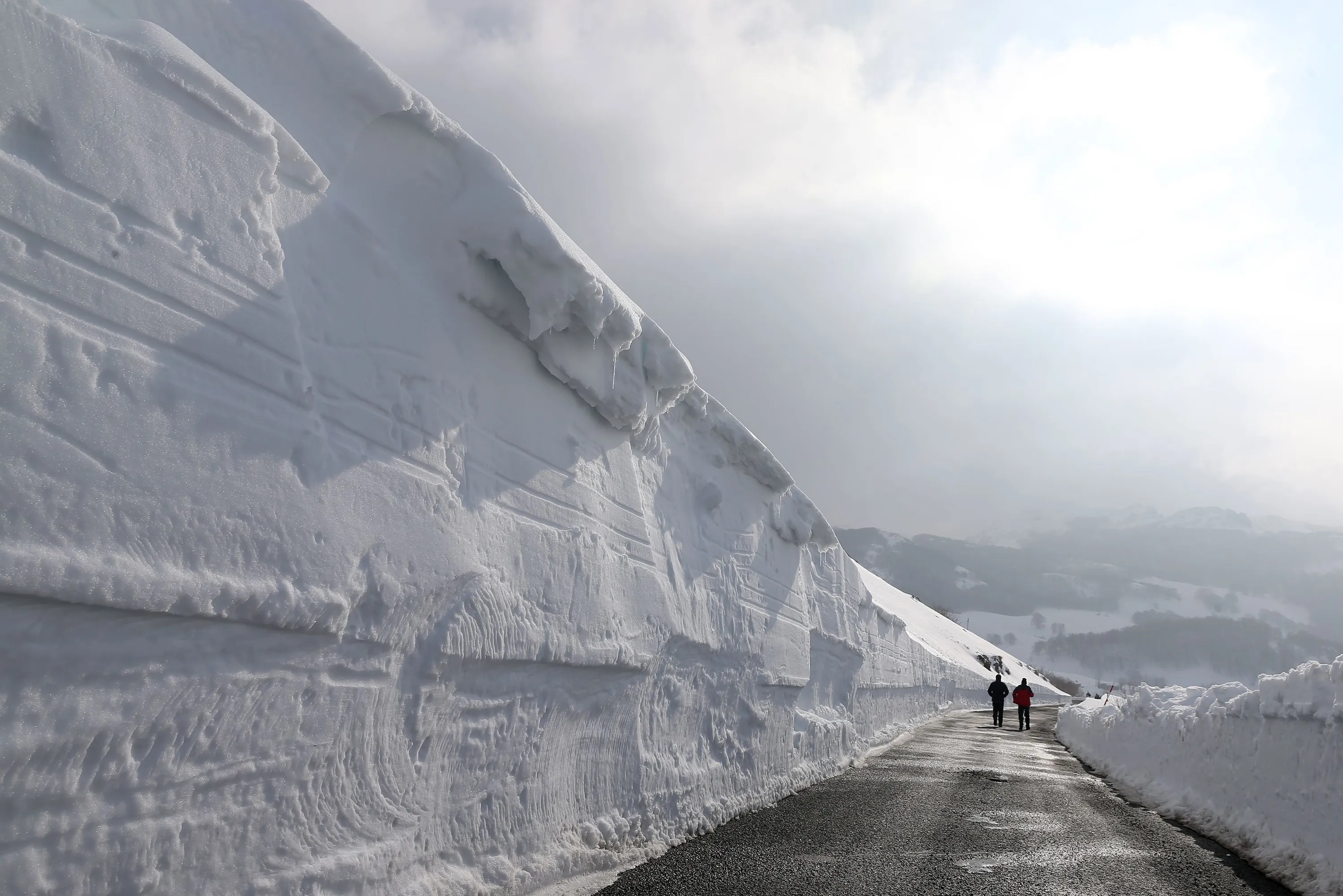 People walk on a road after heavy snowfall between Las Machorras and the ski resort of Lunada, near Espinosa de los Monteros, in the northern province of Burgos on March 13, 2016. (Photo by Cesar Manso/AFP Photo)