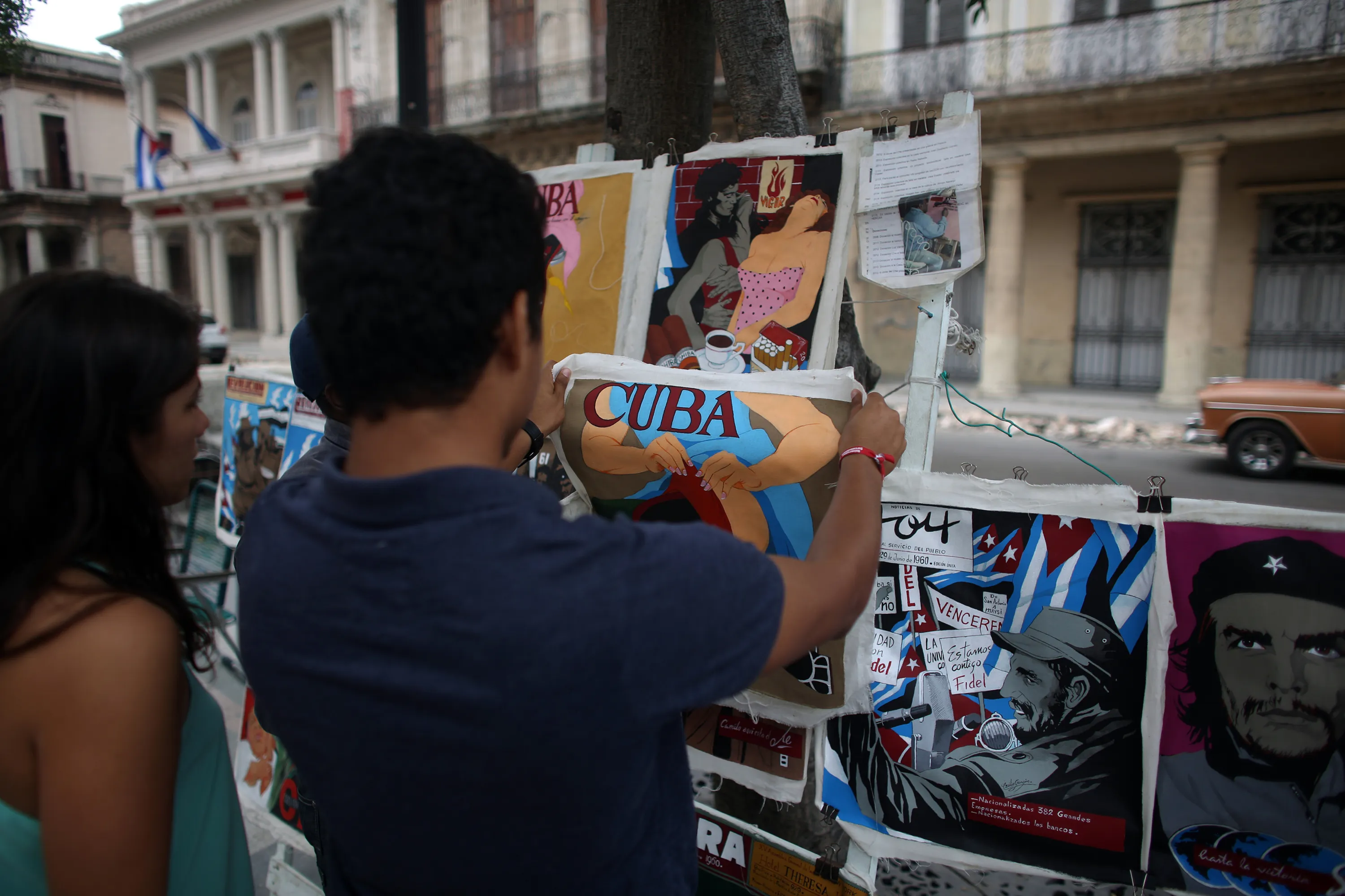 Tourists from Colombia look at posters in a street arts fair in Havana, February 20, 2016. (Photo by Alexandre Meneghini/Reuters)