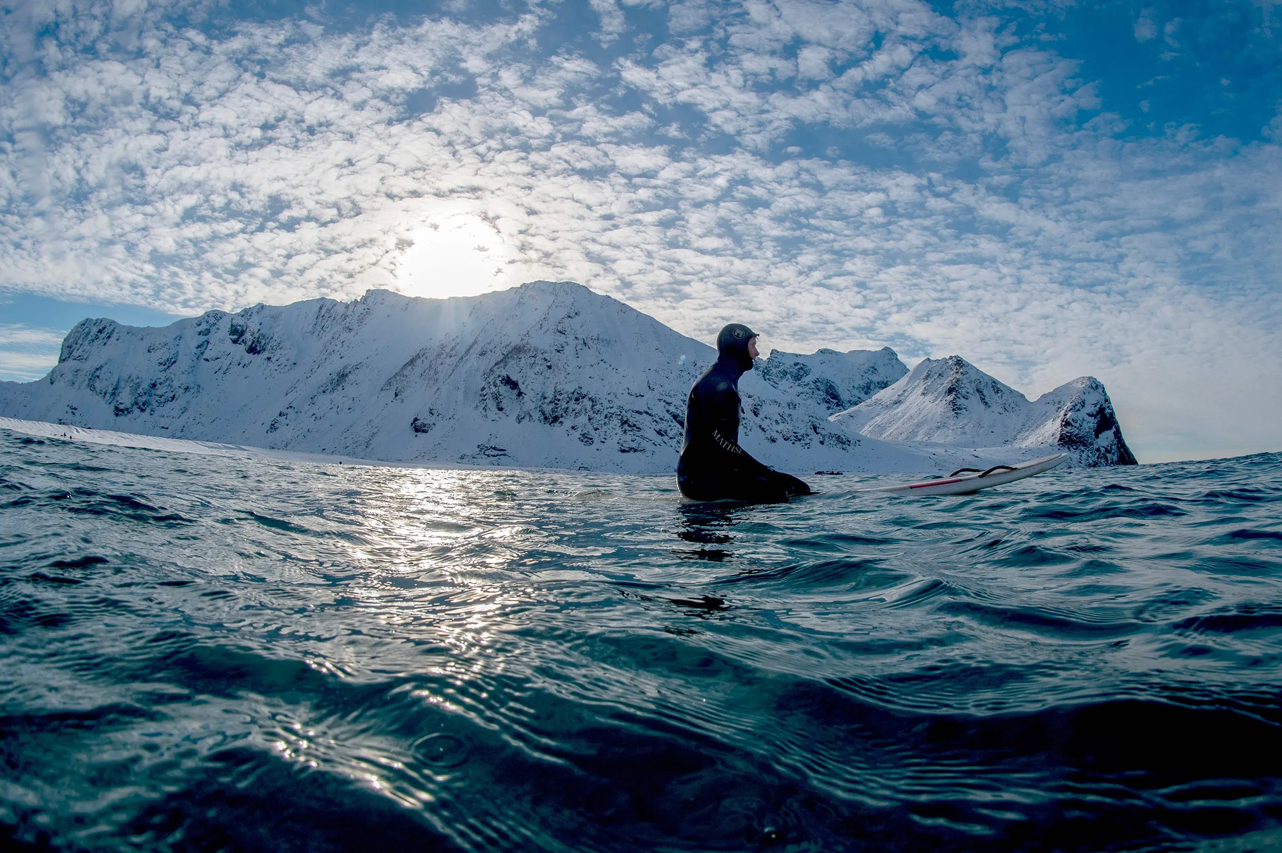 Surf instructor Tommy Olsen monitors his group of surf beginners during their 1st course at snowy beach of Unstad, in Lofoten Island, Arctic Circle, on March 09, 2016. Surfers from all over the world comes to Lofoten island to surf in extrem conditions. Ocean temperature is 6-7 °C, air temperature around 0°C in spite of a weather very unstable. (Photo by Olivier Morin/AFP Photo)