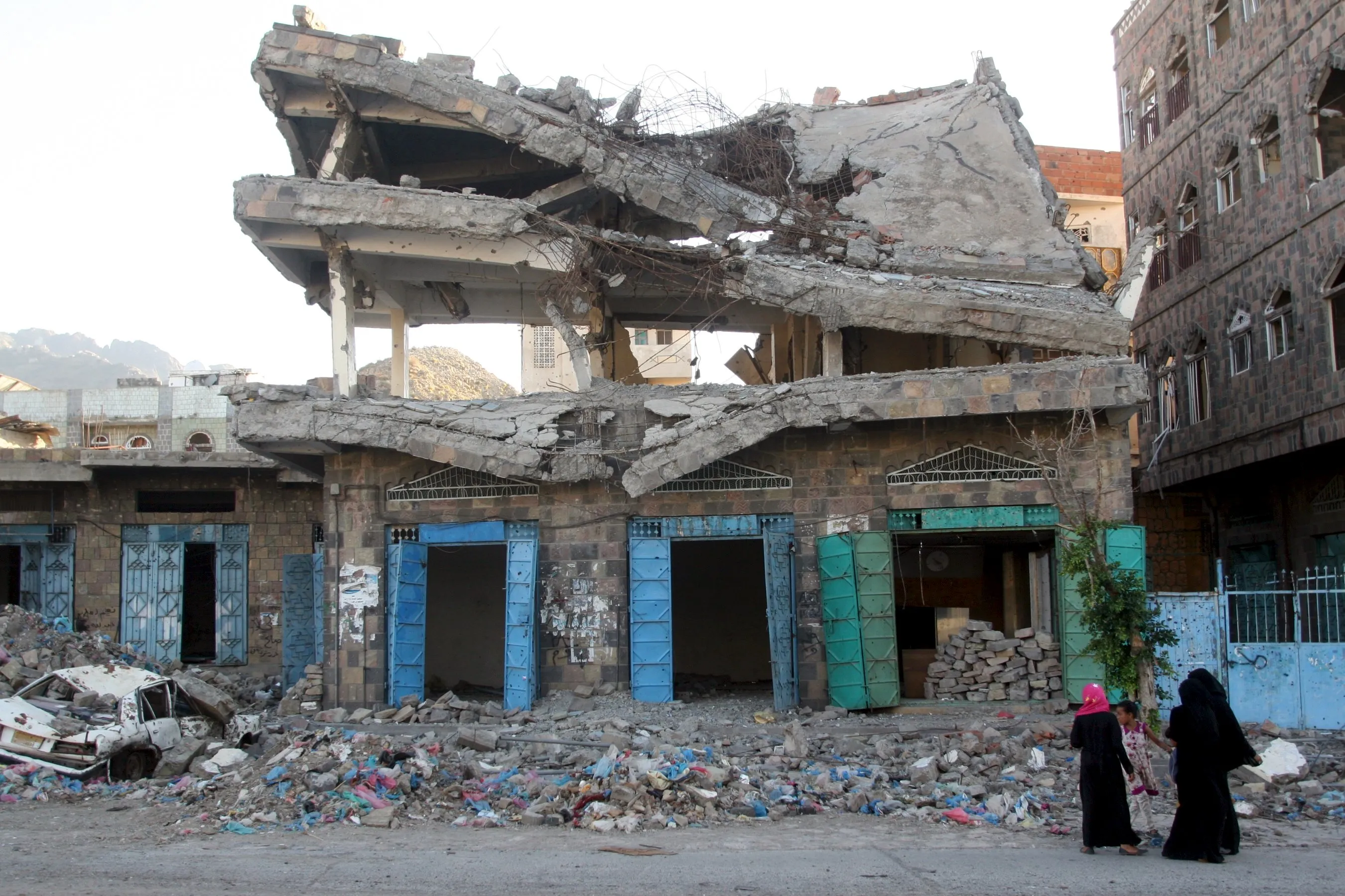 Women look at a building destroyed during recent fighting in Yemen's southwestern city of Taiz March 14, 2016. (Photo by Anees Mahyoub/Reuters)