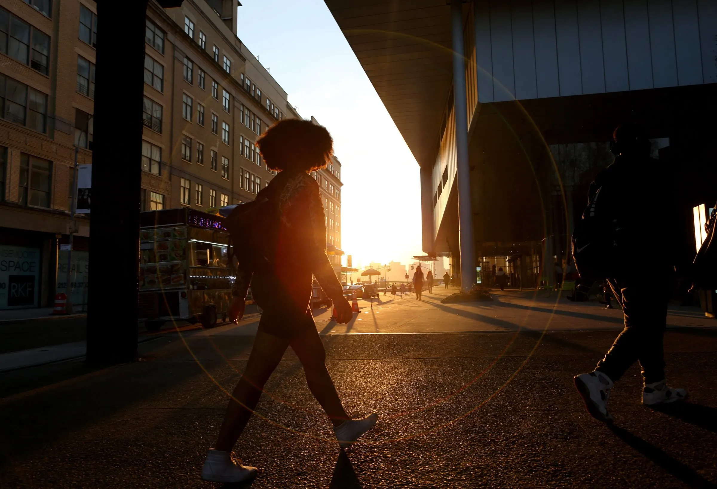 A woman walks near the High Line in the Meatpacking district during a spell of unseasonably warm temperatures in New York, New York, USA, 09 March 2016. (Photo by Andrew Gombert/EPA)