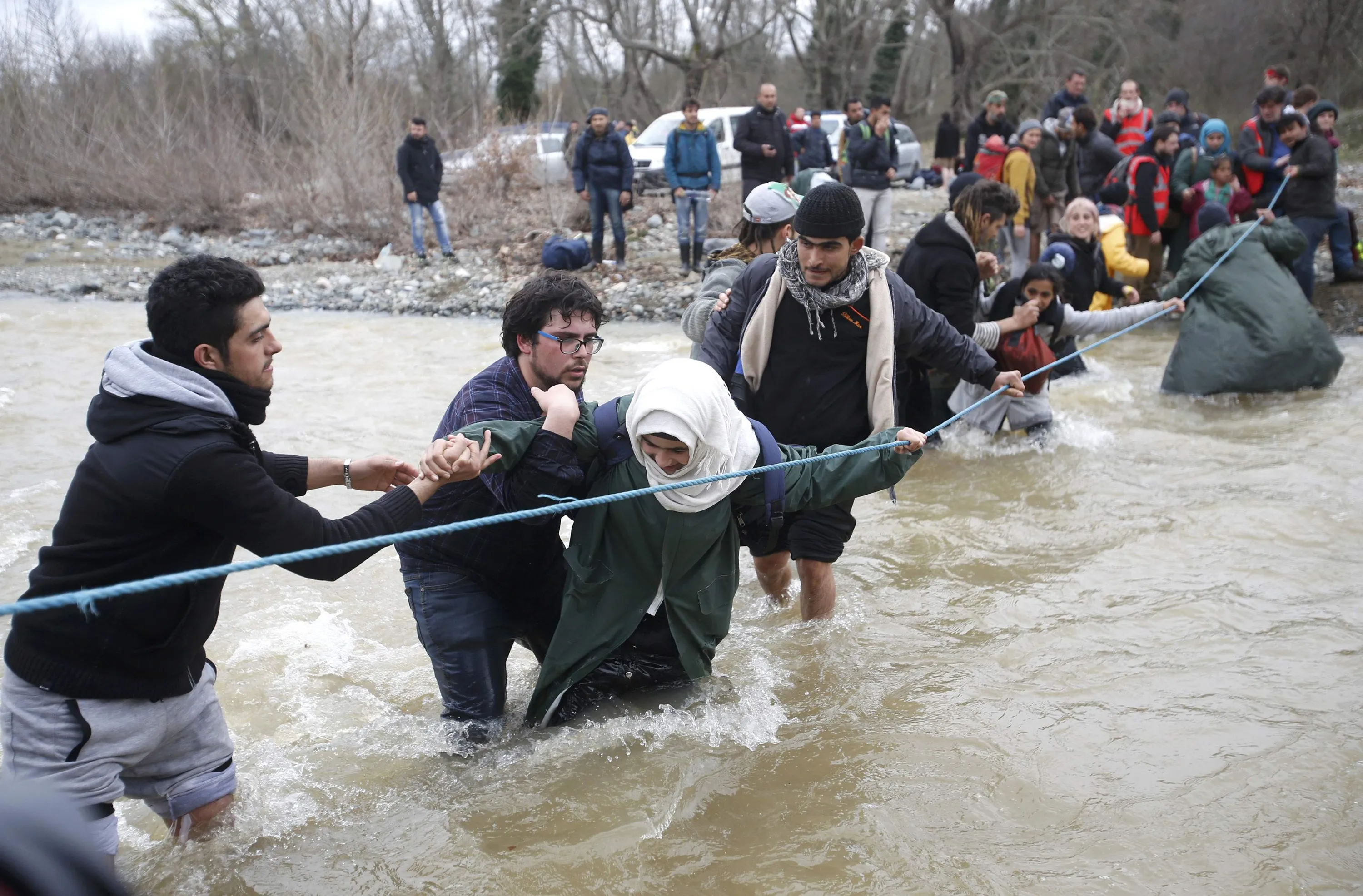 Migrants wade across a river near the Greek-Macedonian border, west of the the village of Idomeni, Greece, March 14, 2016. (Photo by Stoyan Nenov/Reuters)