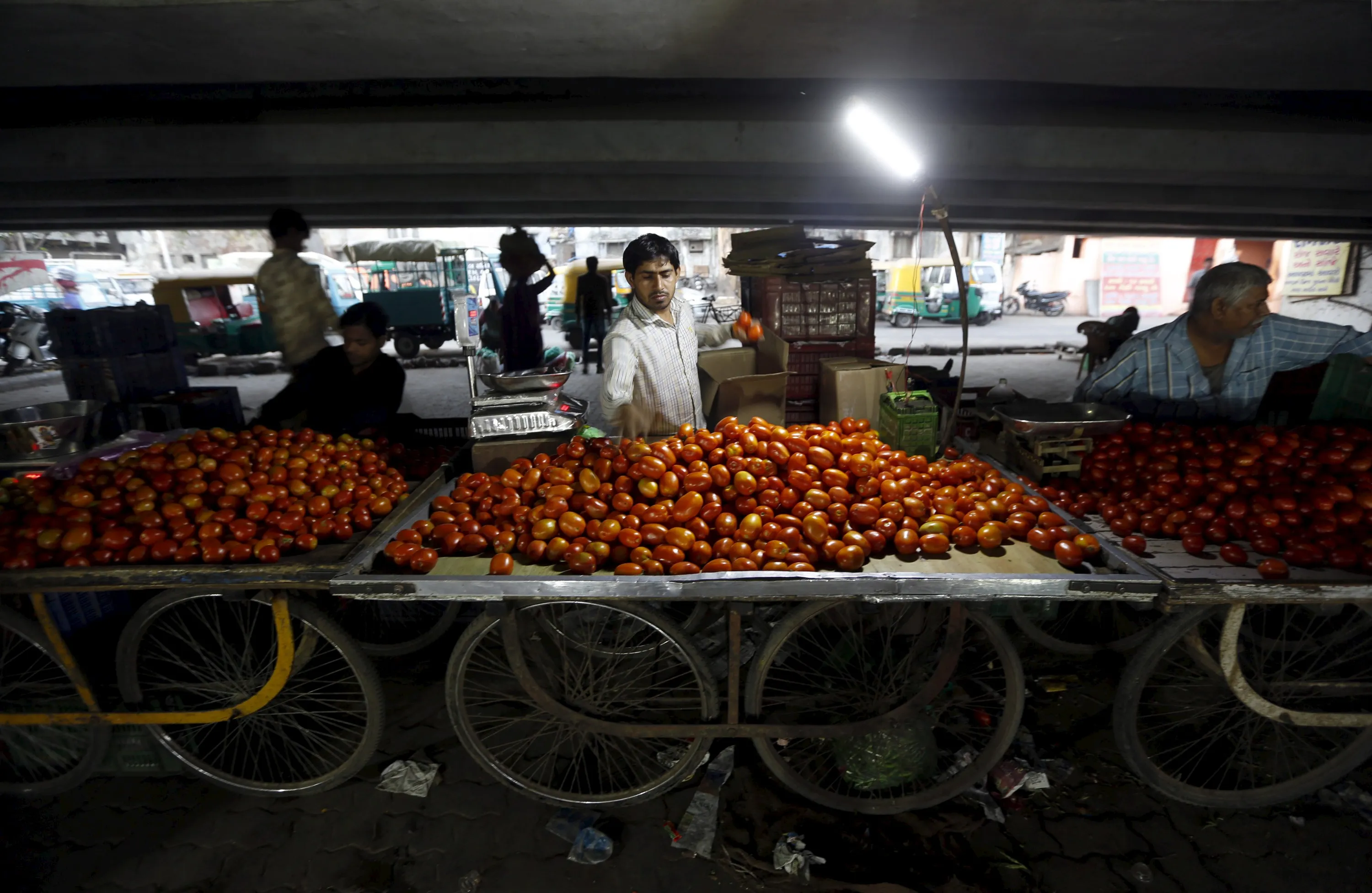 A roadside vendor arranges tomatoes on his handcart as he waits for customers under a flyover in Ahmedabad, India, March 8, 2016. (Photo by Amit Dave/Reuters)