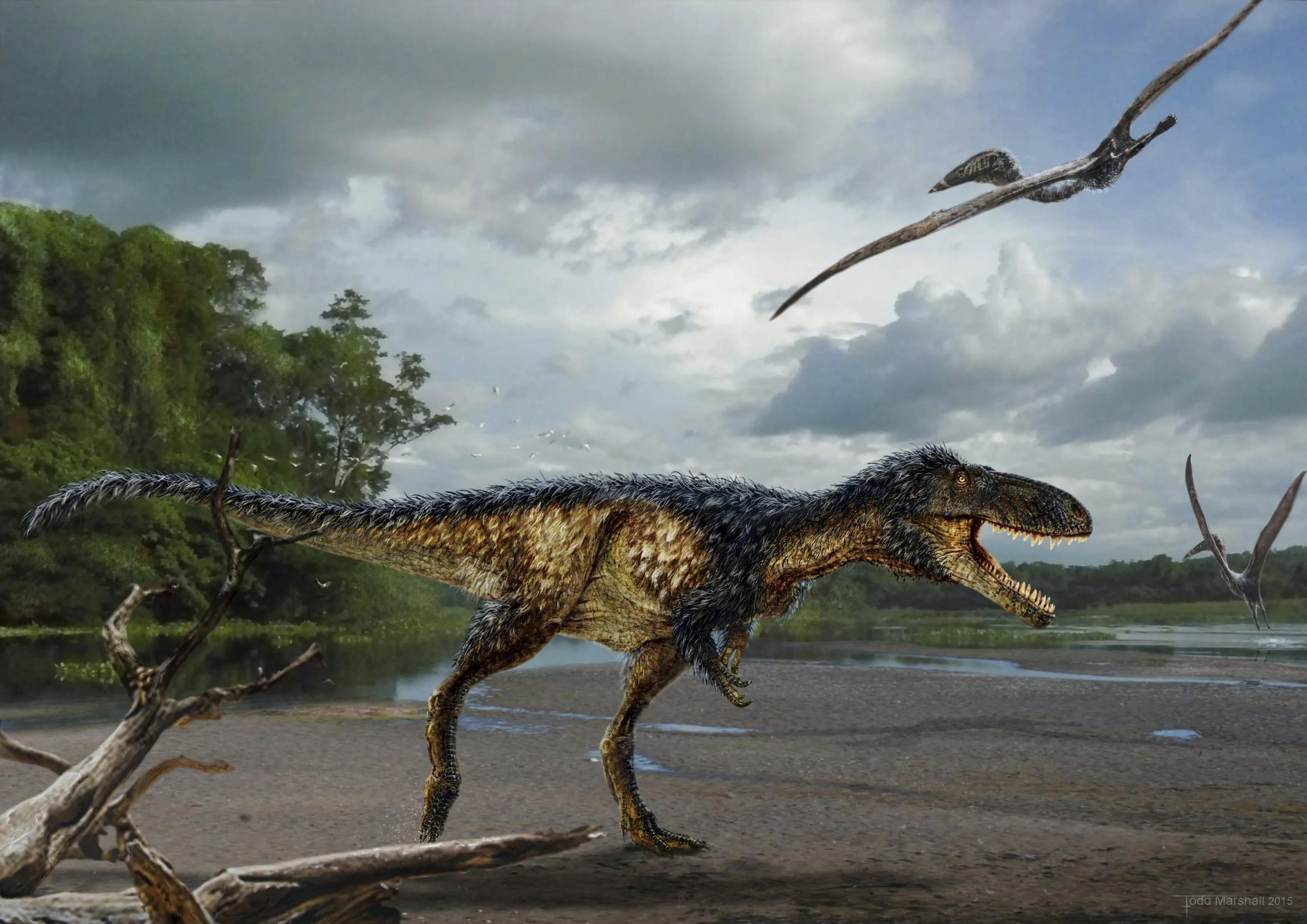 A life reconstruction of the new tyrannosaur Timurlengia euotica, accompanied by two flying reptiles (Azhdarcho longicollis) in their environment 90 million years ago, is pictured in this undated illustration released on March 14, 2016. (Photo by Reuters/Original painting by Todd Marshall/Proceedings of the National Academy of Sciences)