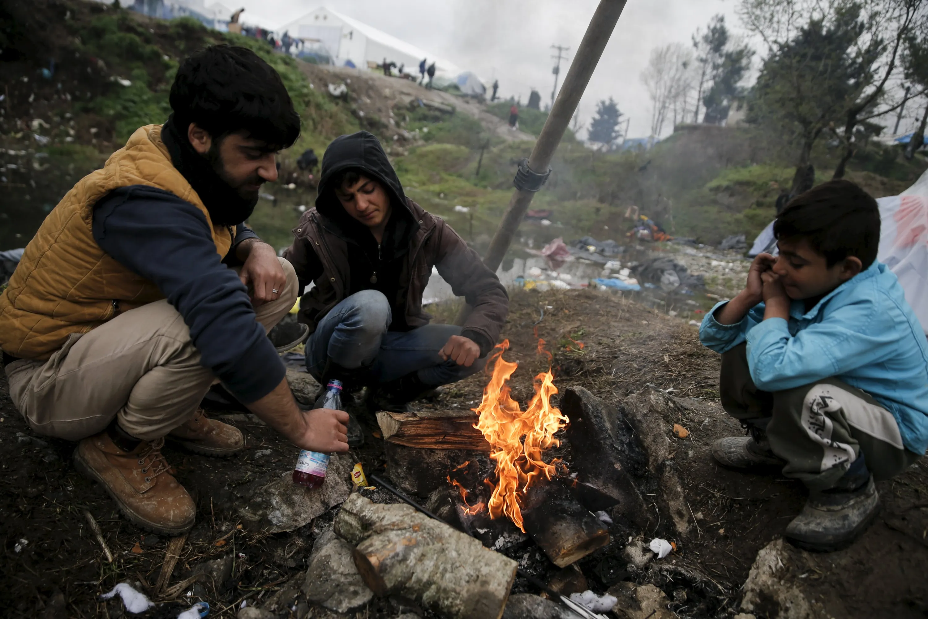 Migrants warm themselves next to a bonfire at a makeshift camp at the Greek-Macedonian border, near the village of Idomeni, Greece March 15, 2016. (Photo by Alkis Konstantinidis/Reuters)