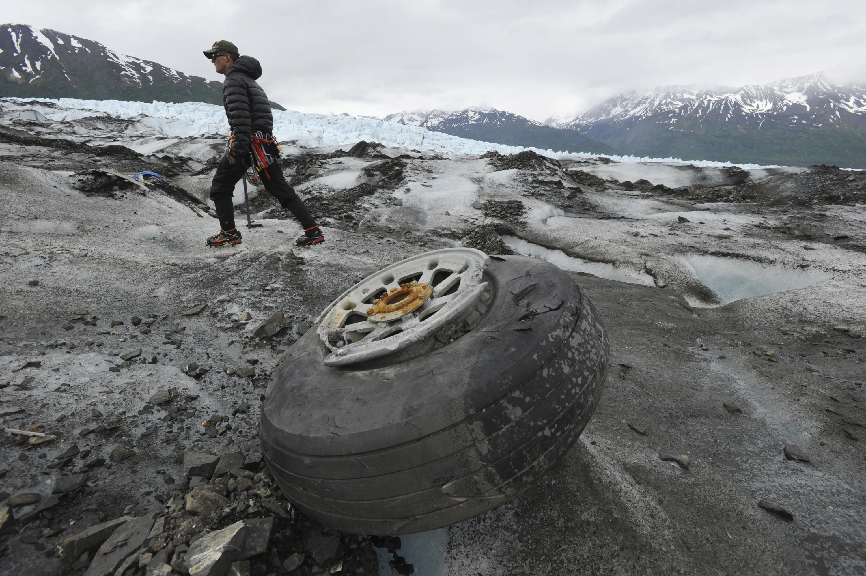 In this June 10, 2015 file photo, U.S. Marines Capt. David Gooch, with the Defense POW/MIA Accounting Agency, walks past an aircraft wheel assembly resting on the ice surface of Colony Glacier in Alaska. The Air Force says it's identified more remains of service members who died when a military transport plane slammed into the Alaska mountain six decades ago, killing all 52 people aboard. Military officials say 31 victims have been recovered and identified since the wreckage of the C-124 Globemaster was rediscovered four years ago. An Alaska Army National Guard helicopter crew flying over the area spotted the debris about 50 miles northeast of Anchorage. (Photo by Bill Roth/Alaska Dispatch News via AP Photo)
