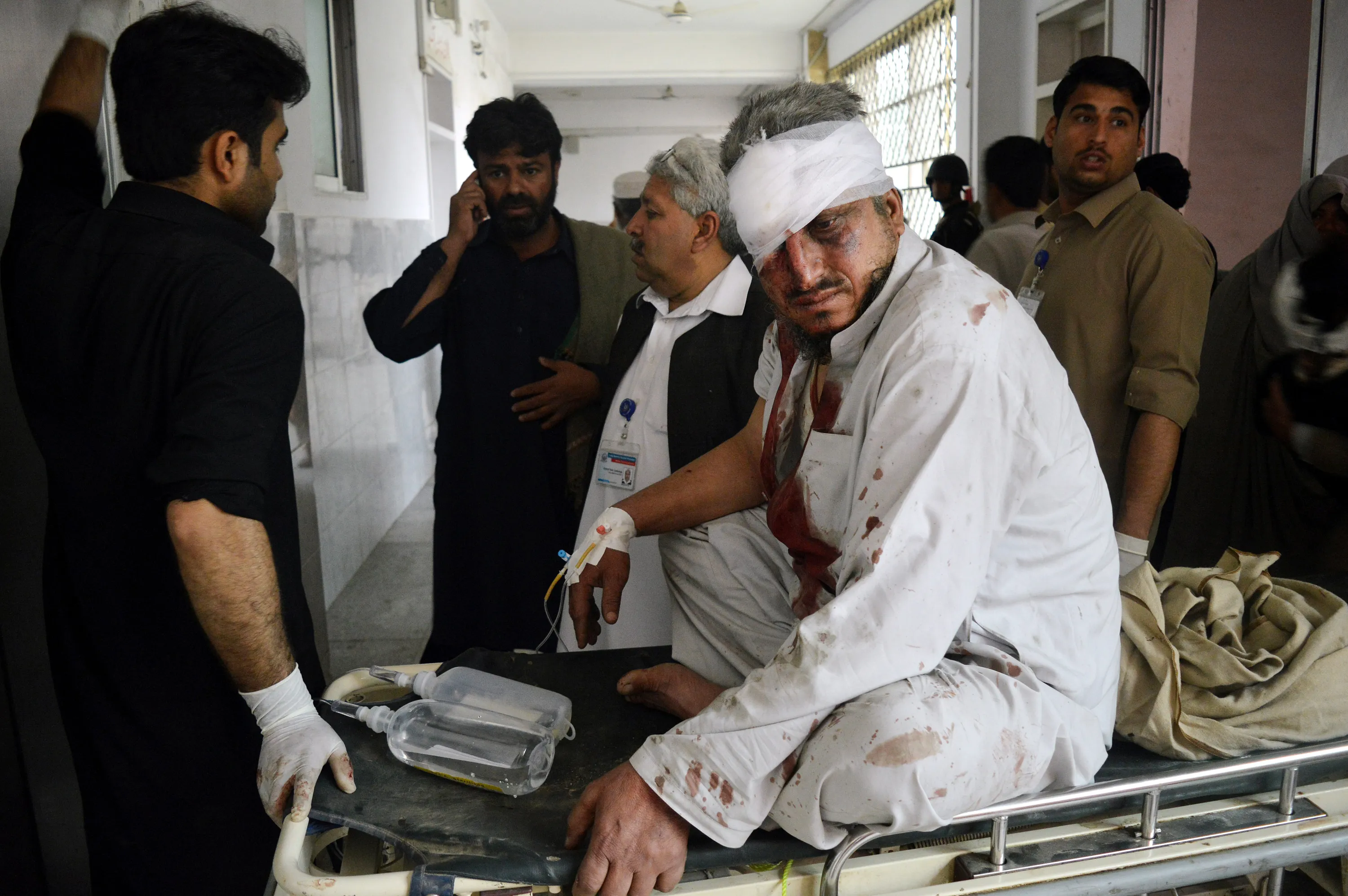 A Pakistani man who is injured in a bomb blast arrives at a local hospital in Peshawar, Pakistan, Wednesday, March 16, 2016. A bomb ripped through a bus carrying Pakistani government employees in the northwestern city of Peshawar on Wednesday, killing a number of people, police said. (Photo by Mohammad Sajjad/AP Photo)