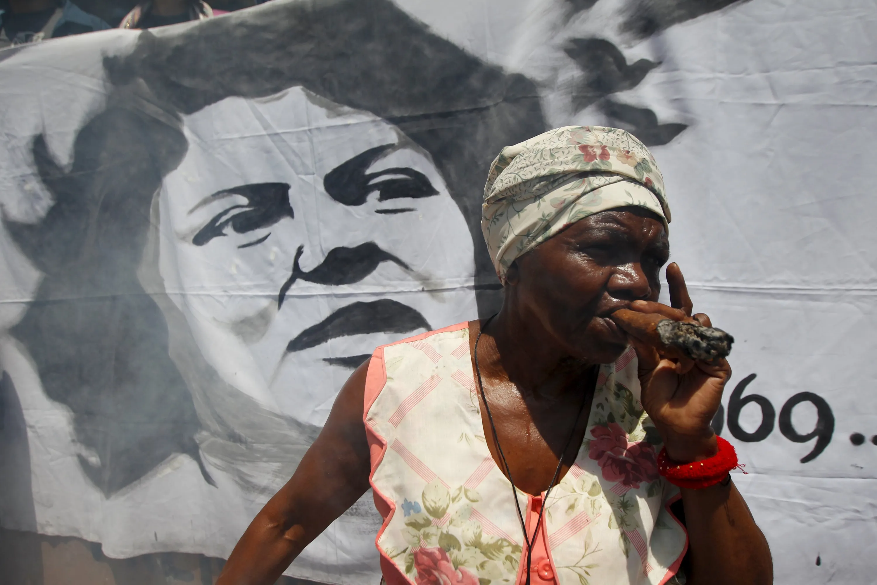 A Garifuna woman smokes a cigar in front of a banner depicting an image of slain environmental rights activist Berta Caceres during a protest to demand justice in Tegucigalpa, Honduras, March 17, 2016. (Photo by Jorge Cabrera/Reuters)