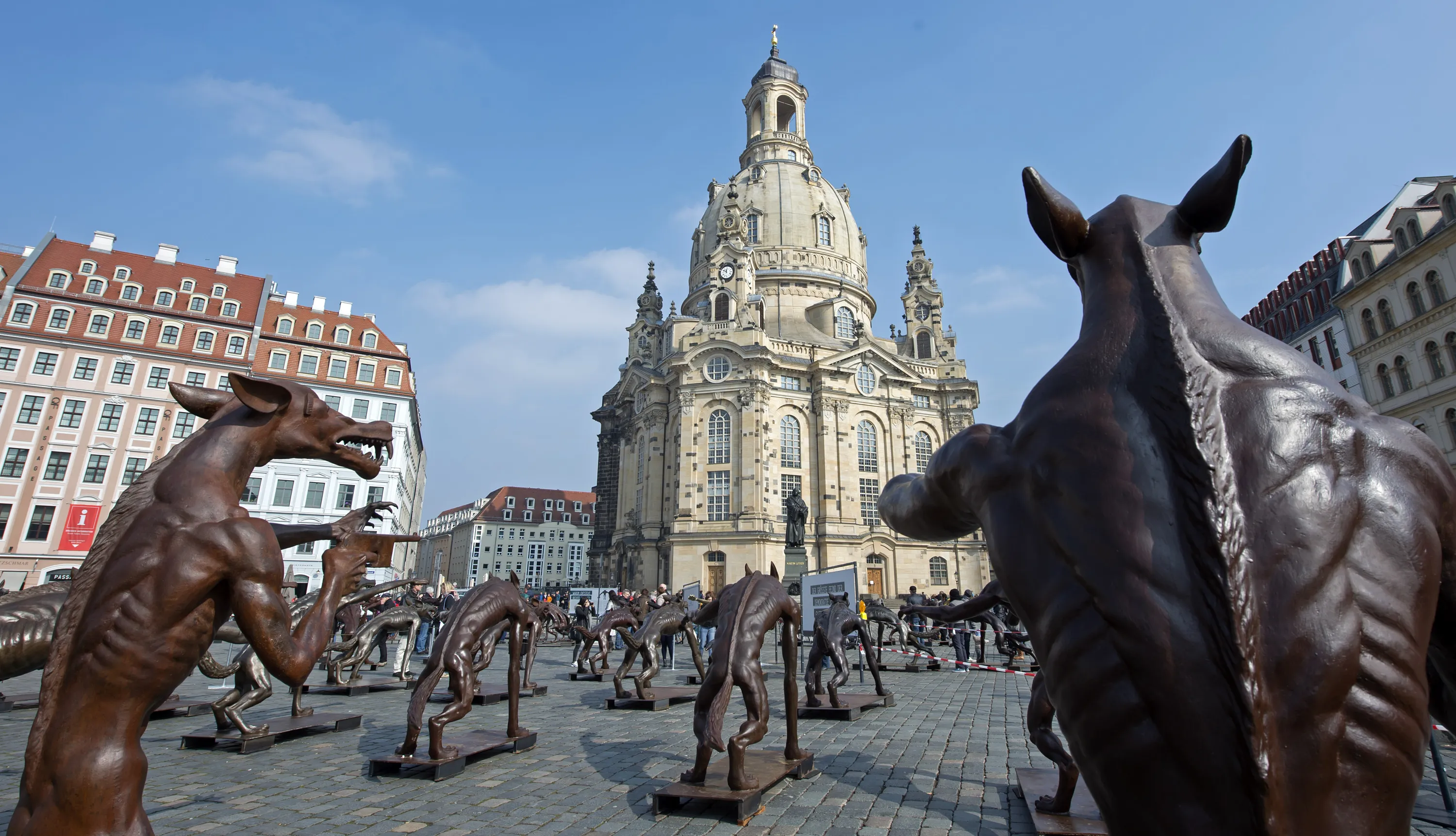 Sculptures by artist Rainer Opolka stand in front of the Church of Our Lady (Frauenkirche) in Dresden, eastern Germany, Friday, March 18, 2016. The 66 life-sized metal wolf sculptures are part of the exhibition “The wolves are back”, which is to focus on the hazards of xenophobia, hate and right-wing extremism. (Photo by Jens Meyer/AP Photo)