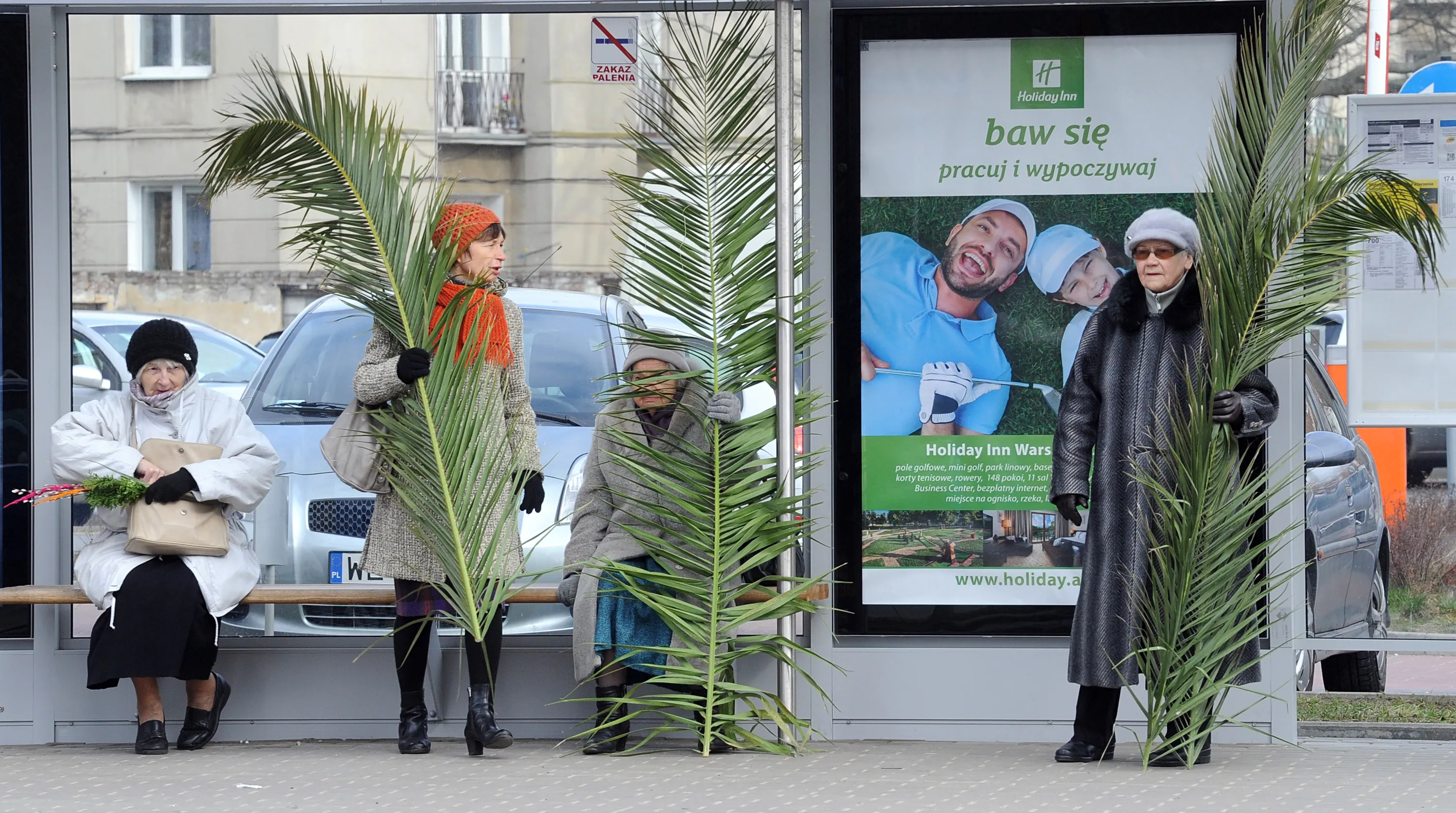 Women with palm leaves wait at a bus stop after a Palm Sunday procession in Warsaw, Poland, Sunday, March 20, 2016. Palm Sunday opens the Holy Week that ends with Easter Sunday, the most important Catholic holiday. (Photo by Alik Keplicz/AP Photo)