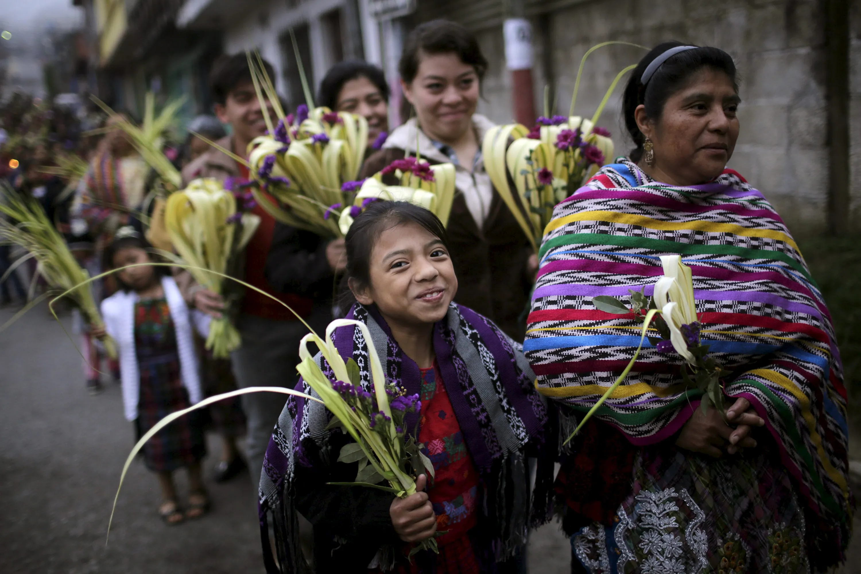 Indigenous people hold traditional palm fronds during a Catholic Palm Sunday procession on the streets of San Pedro Sacatepequez, Guatemala, March 20, 2016. (Photo by Saul Martinez/Reuters)