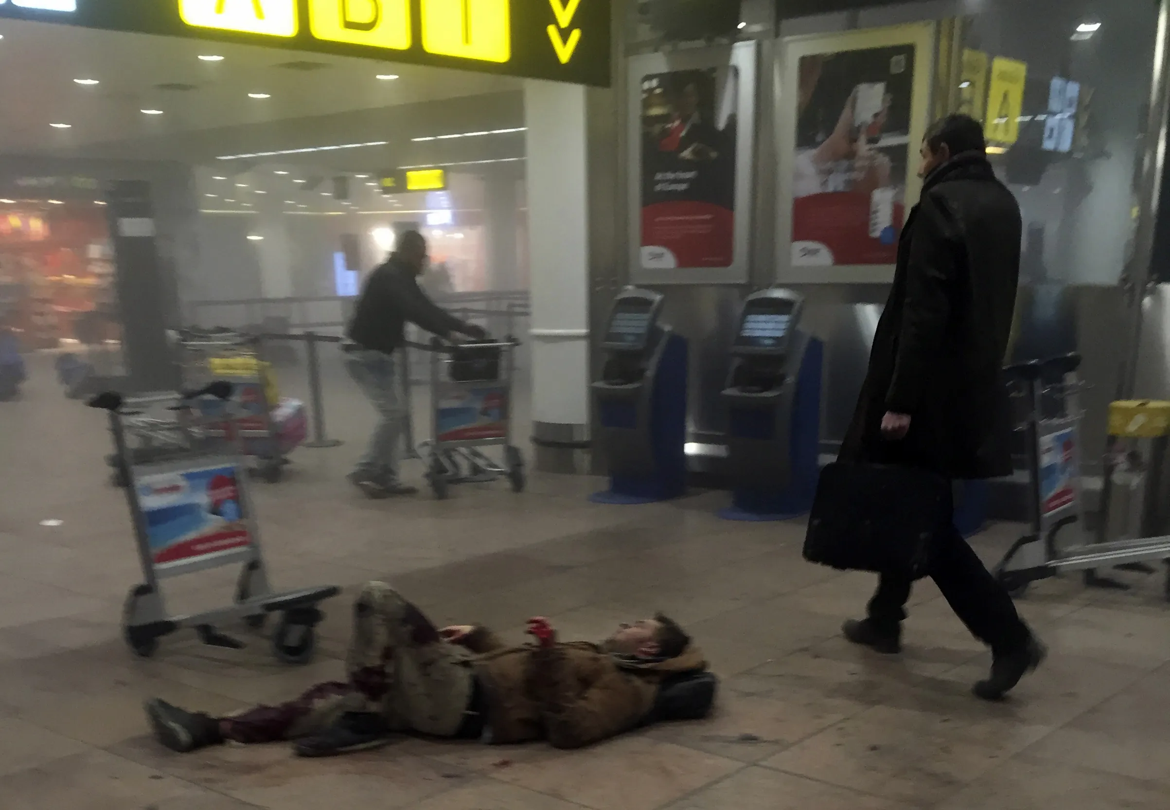 In this photo provided by Georgian Public Broadcaster and photographed by Ketevan Kardava, an injured man lies on the floor in Brussels Airport in Brussels, Belgium, after explosions were heard Tuesday, March 22, 2016. A developing situation left a number dead in explosions that ripped through the departure hall at Brussels airport Tuesday, police said. All flights were canceled, arriving planes were being diverted and Belgium's terror alert level was raised to maximum, officials said. (Photo by Ketevan Kardava/Georgian Public Broadcaster via AP Photo)
