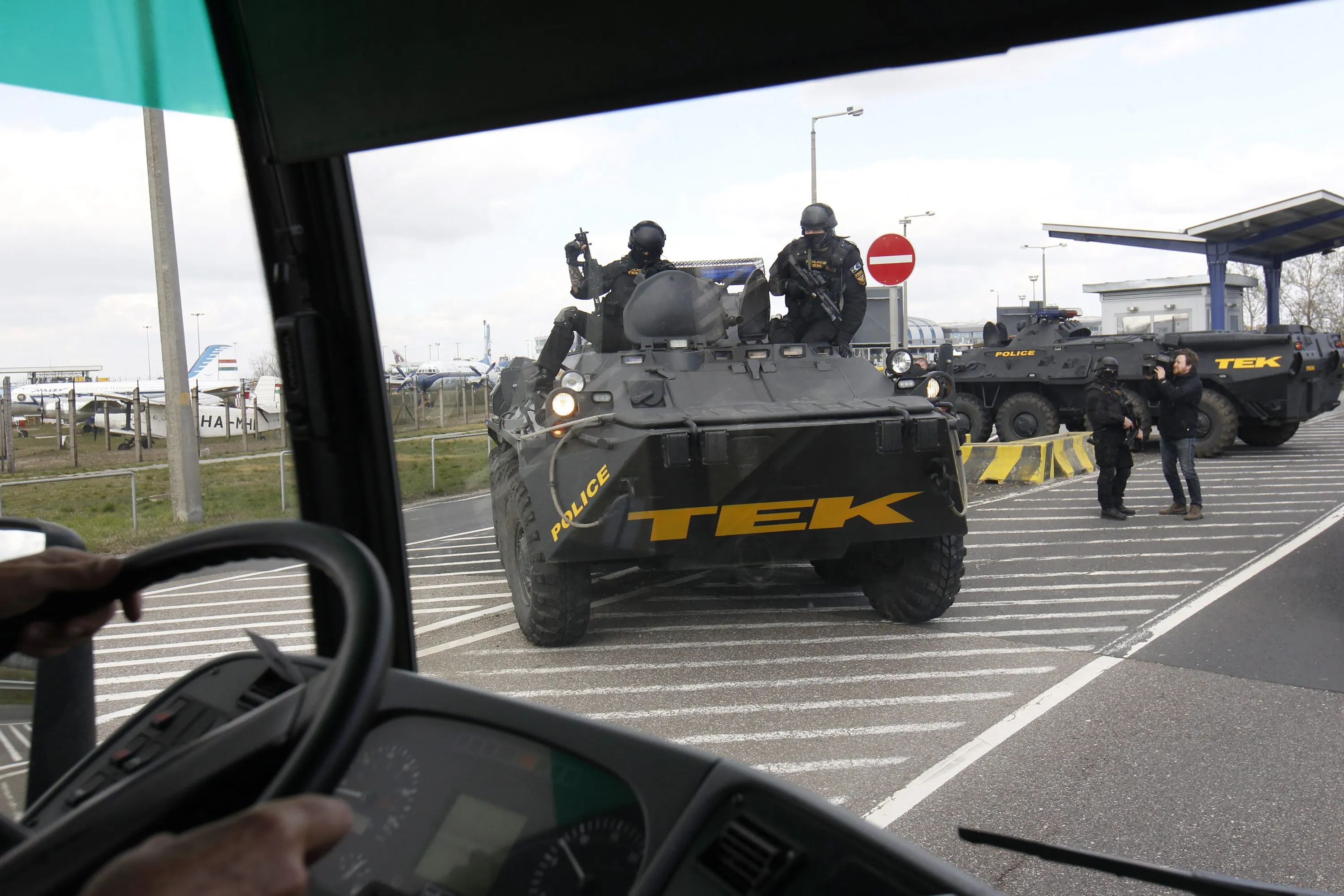 Counter Terrorism Centre (TEK) personnel arrive with an APC vehicle at the parking facility of the Liszt Ferenc International Airport in Budapest, Hungary, Tuesday, March 22, 2016. Hungary raised its terrorism awareness level to grade 2 after a series of attacks in Brussels. (Photo by Zsolt Szigetvary/MTI via AP Photo)