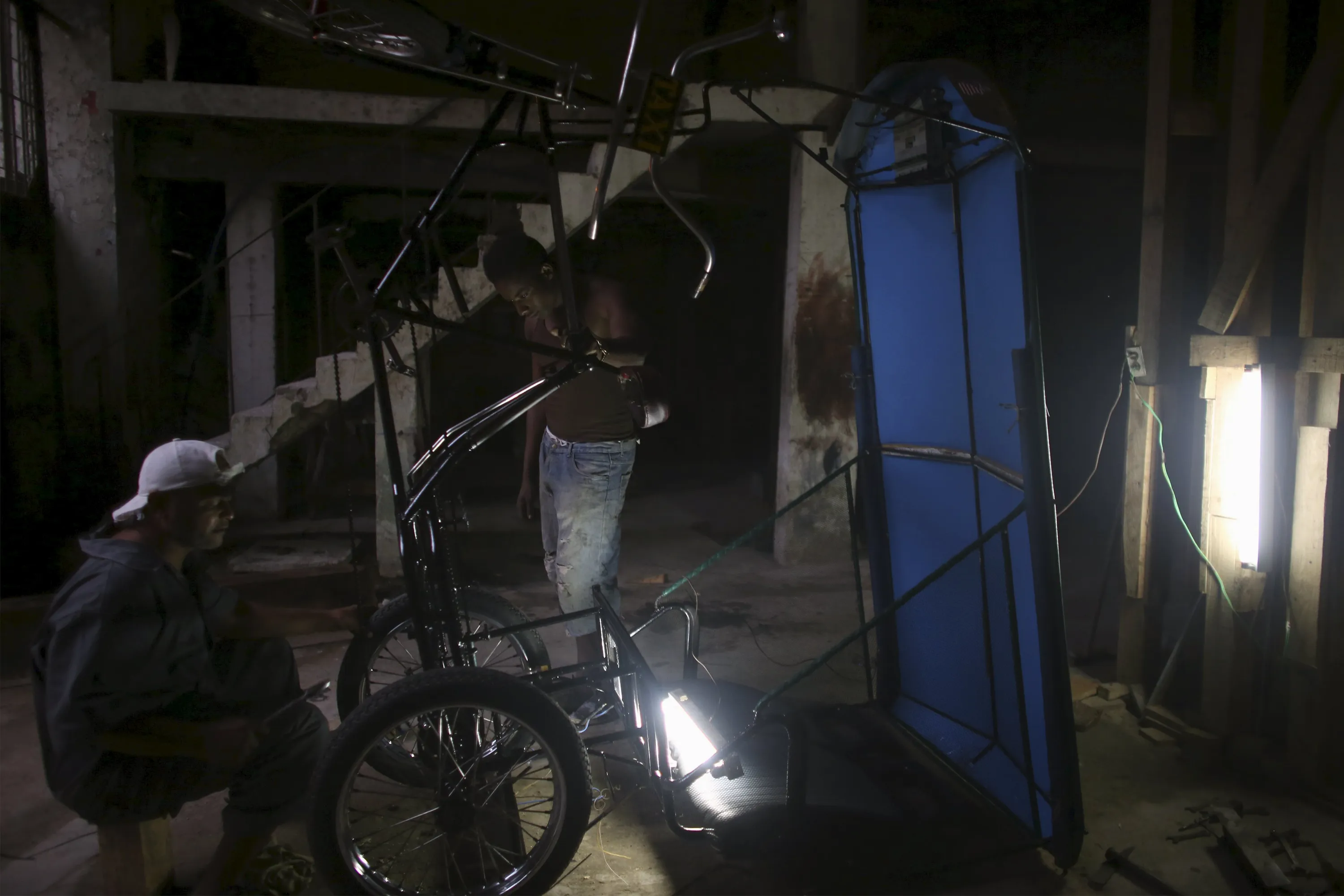 Alexander Ruval 43, (L) and Adrian Hernandez, 25, fix a pedicab in downtown Havana, March 21, 2016. (Photo by Alexandre Meneghini/Reuters)