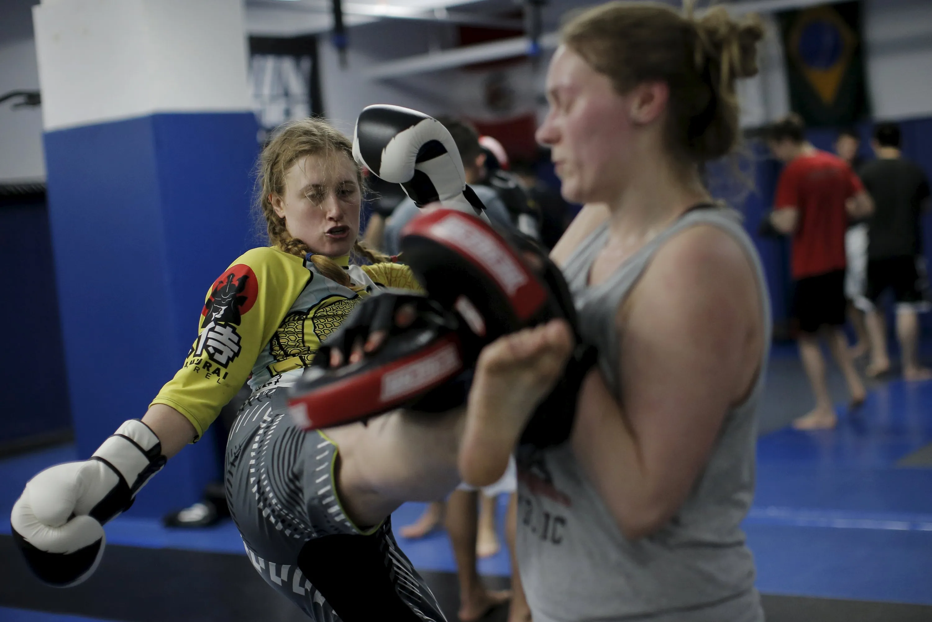 Sam Erenberger (L) trains with a partner at Ronin Athletics, a Mixed Martial Arts gym in midtown Manhattan in New York March 21, 2016. New York is poised to join the rest of the country in legalizing mixed martial arts (MMA) fights, as the state Assembly prepares to pass a bill to end a ban on the full-contact sport, a measure the Senate has approved on multiple occasions over the years. (Photo by Brendan McDermid/Reuters)