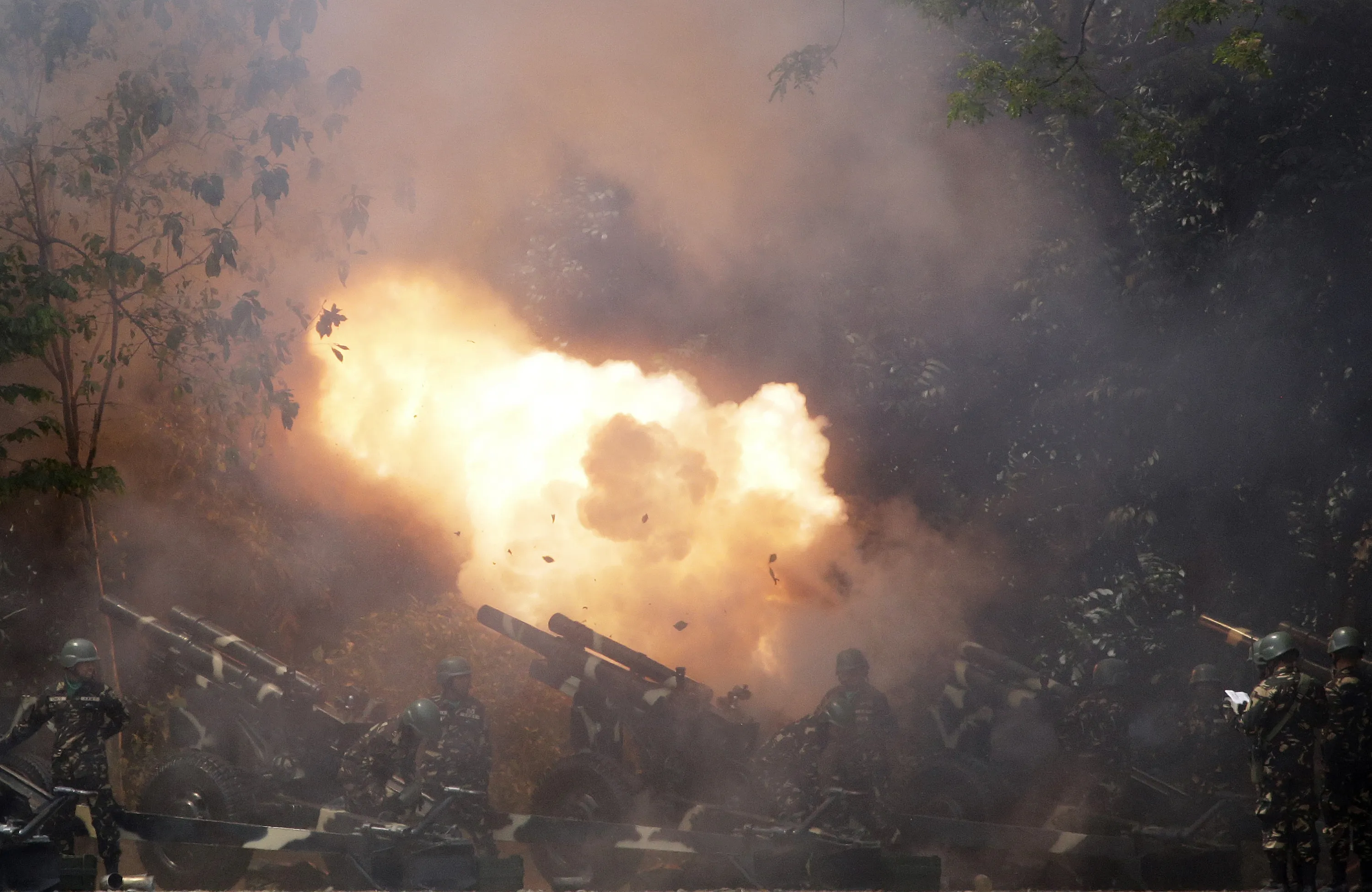Filipino troopers fire cannons during ceremonies for the 119th founding anniversary of the Philippine Army in suburban Taguig, south of Manila, Philippines on Tuesday, March 22, 2016. Under the administration of Philippine President Benigno Aquino III, the Philippine military continues to it's modernization program as it deals with major security concerns, including Communist and Muslim insurgencies and South China Sea territorial disputes involving China, the Philippines and four other governments. (Photo by Aaron Favila/AP Photo)