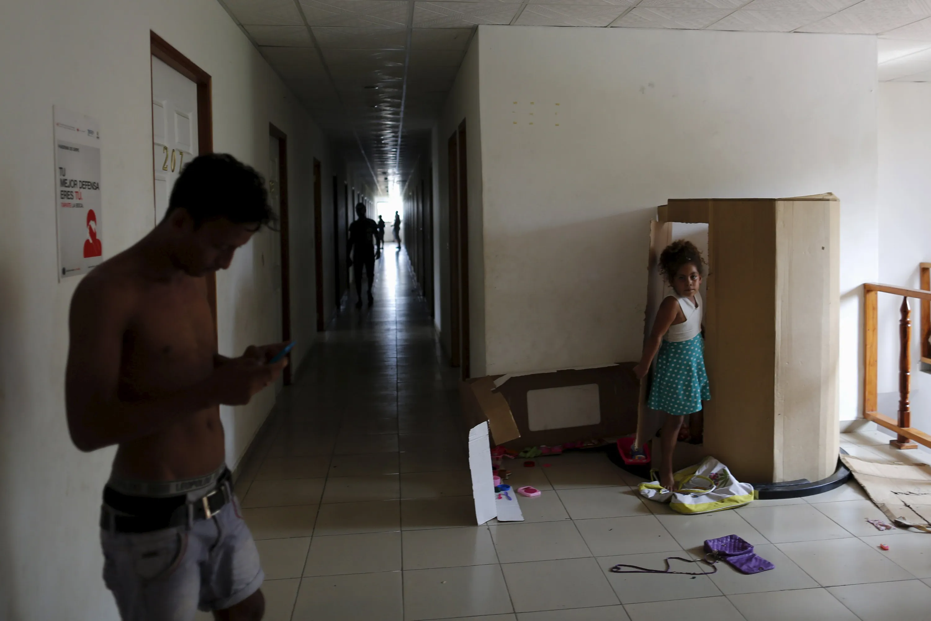 A child plays in a doll house made from a carton, inside an old hotel used as a provisional shelter in Paso Conoa, at the border with Costa Rica March 20, 2016. (Photo by Carlos Jasso/Reuters)