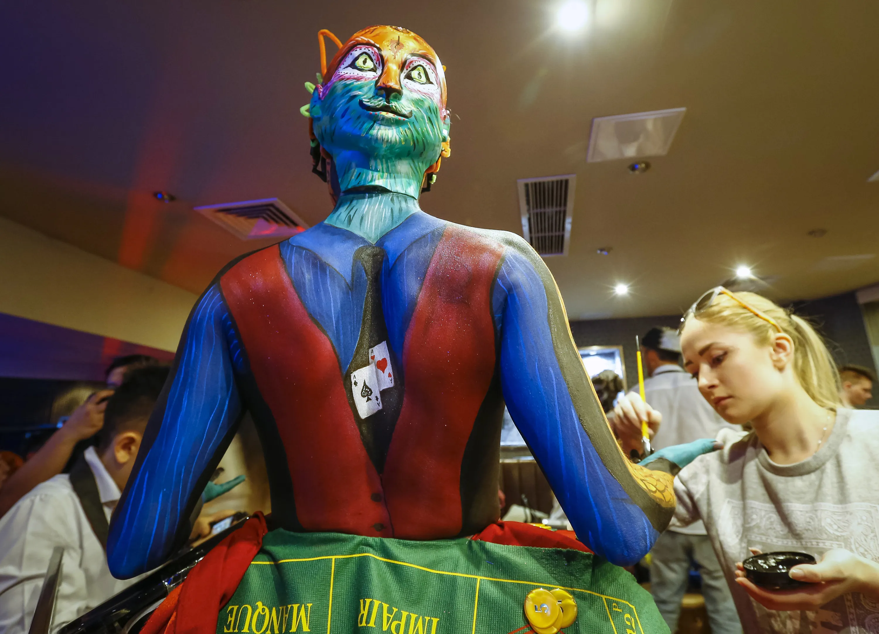 An artist paints a model backstage during a body art festival in Almaty, Kazakhstan, March 23, 2016. (Photo by Shamil Zhumatov/Reuters)