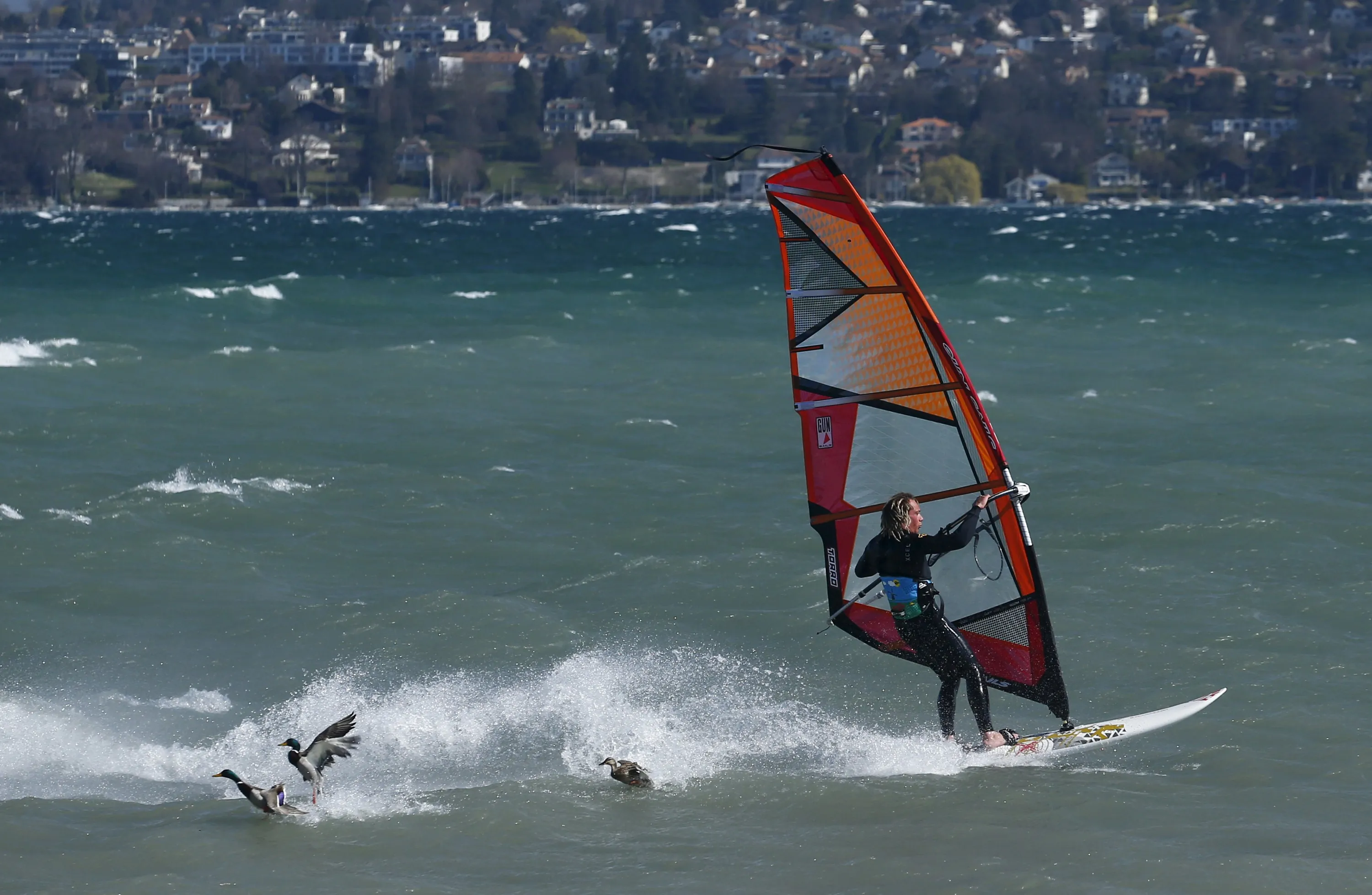 A windsurfer performs a maneuver near ducks on a strong northerly windy day on Lake Leman in Geneva, Switzerland, March 23, 2016. (Photo by Denis Balibouse/Reuters)
