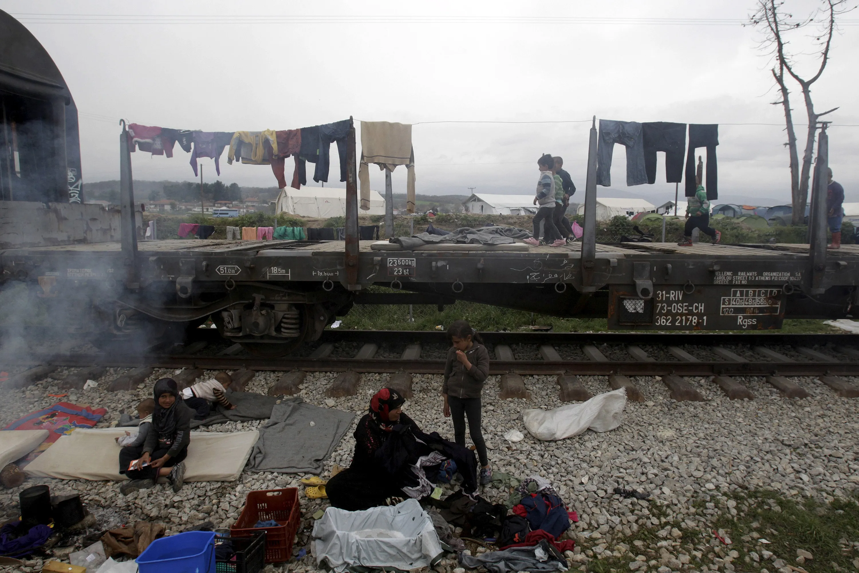 Refugees sit next to railway tracks in a makeshift camp for refugees and migrants at the Greek-Macedonian border near the village of Idomeni, Greece, March 23, 2016. (Photo by Alexandros Avramidis/Reuters)