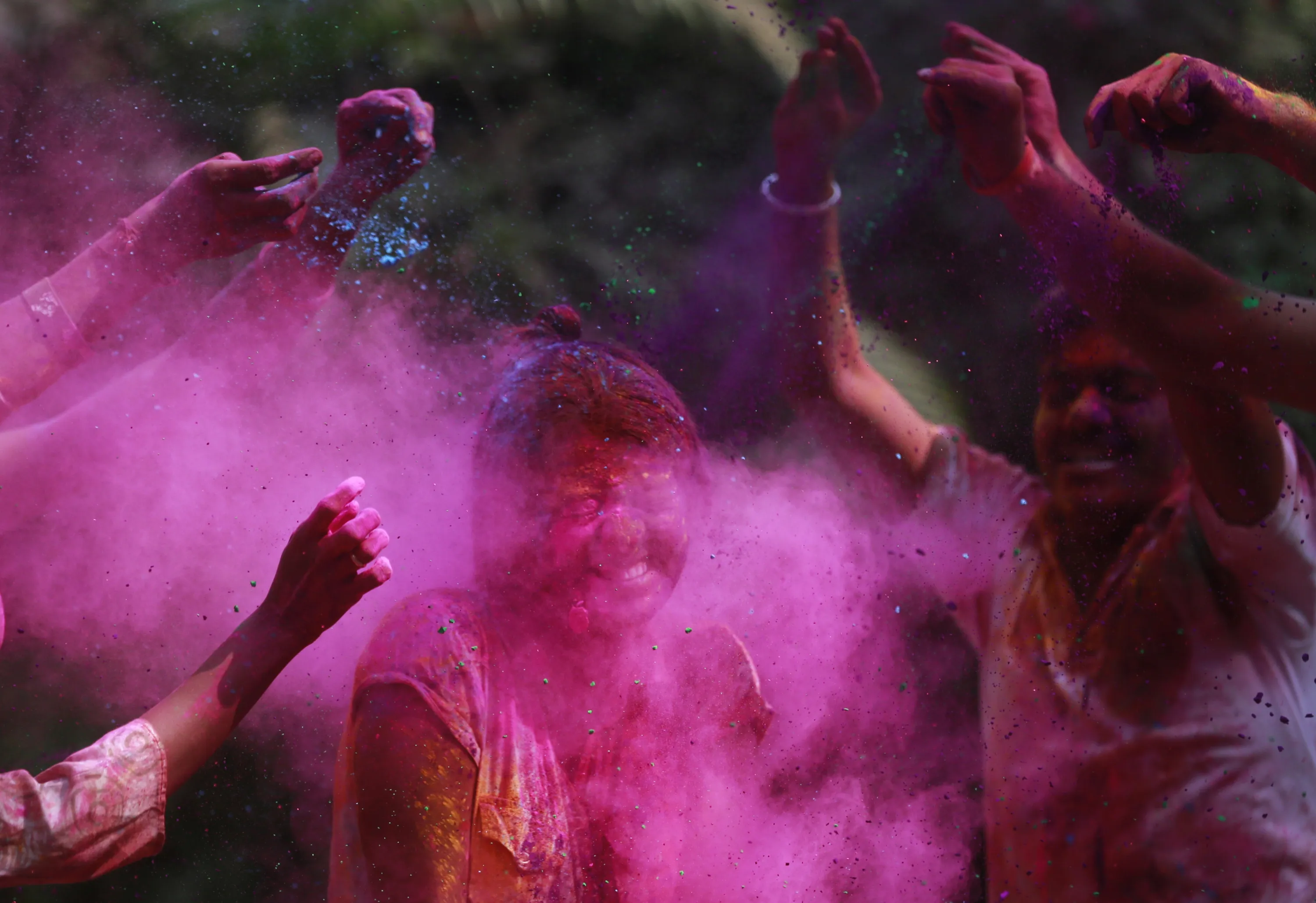 People smear colored powder on the face of a girl during celebrations marking Holi, the Hindu festival of colors, in Mumbai India, Thursday, March 24, 2016. The festival heralds the arrival of spring. (Photo by Rafiq Maqbool/AP Photo)