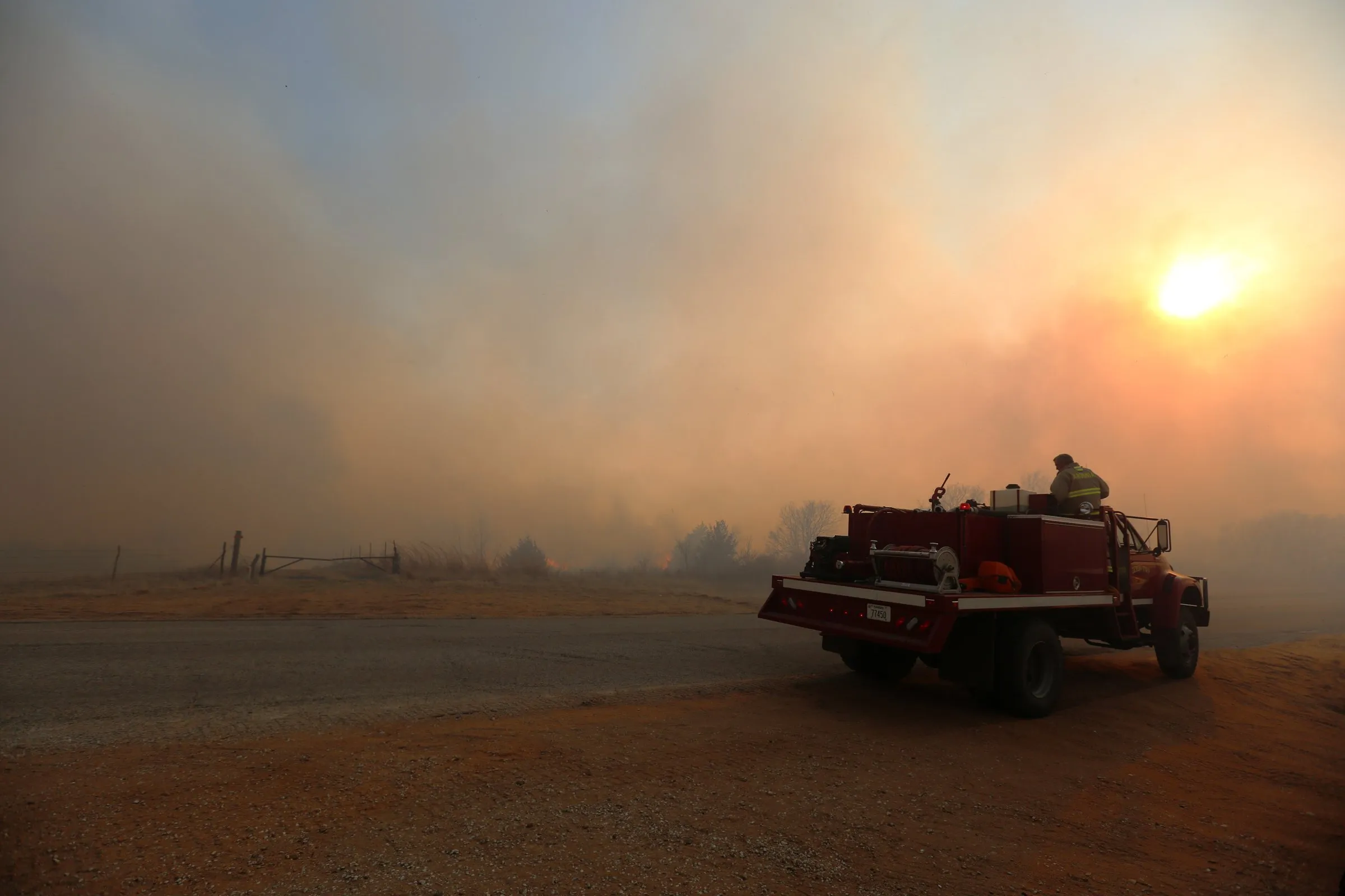 A fire truck from Argonia, Kan., heads west towards Lake City, Kan., to help battle a large grass fire Wednesday, March 23, 2016. (Photo by Travis Morisse/The Hutchinson News via AP Photo)