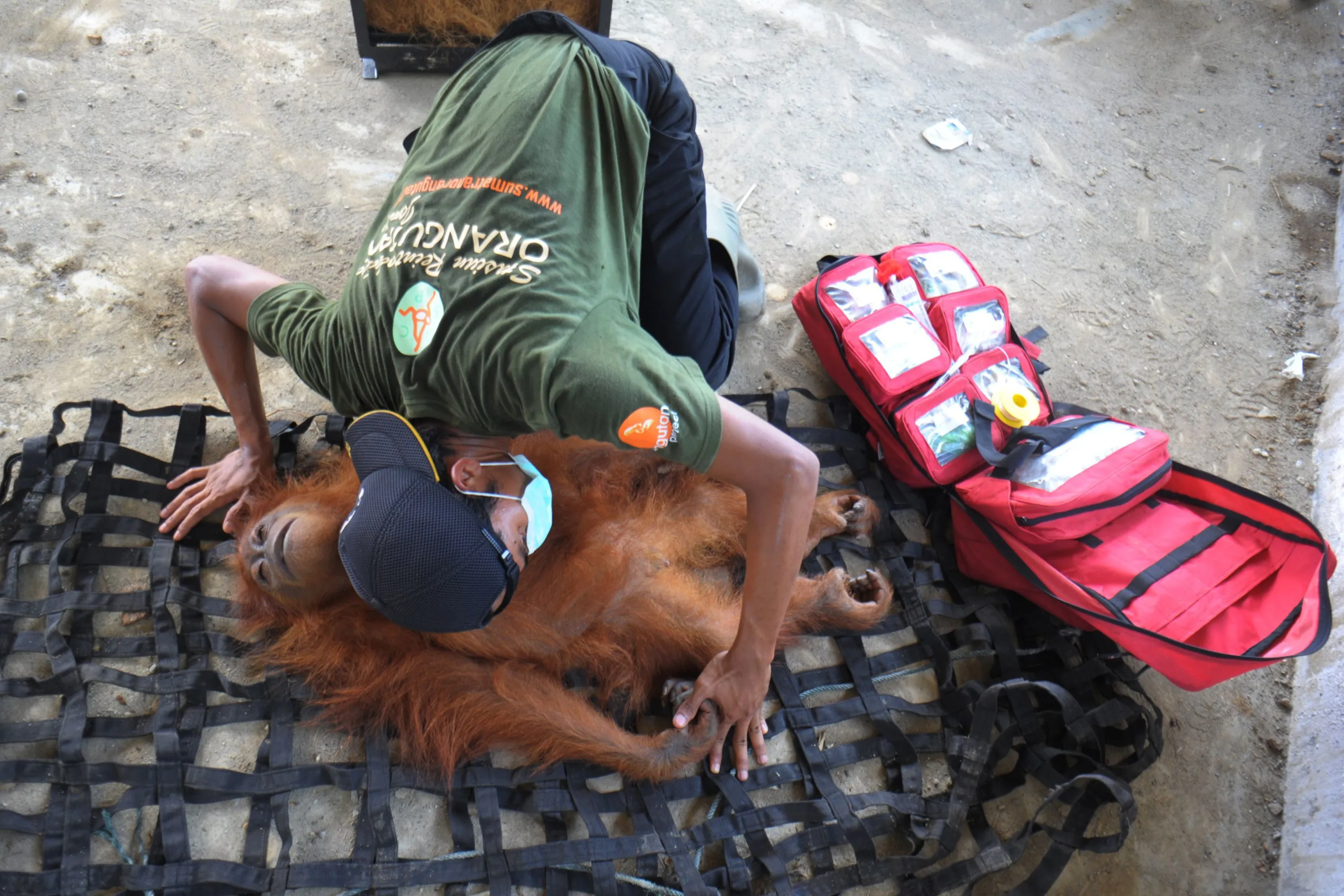 An environmental activist from the Sumatran Orangutan Conservation Programme (SOCP) checks on the condition of a 6-year-old wild orangutan rescued from a plantation in Kuala Batee, Aceh province on March 24, 2016. The Orangutan is currently listed as critically Endangered by the IUCN (International Union for the Conservation of Nature and Natural Resources) with only about 6,000 Sumatran orangutans remaining. (Photo by Chaideer Mahyuddin/AFP Photo)