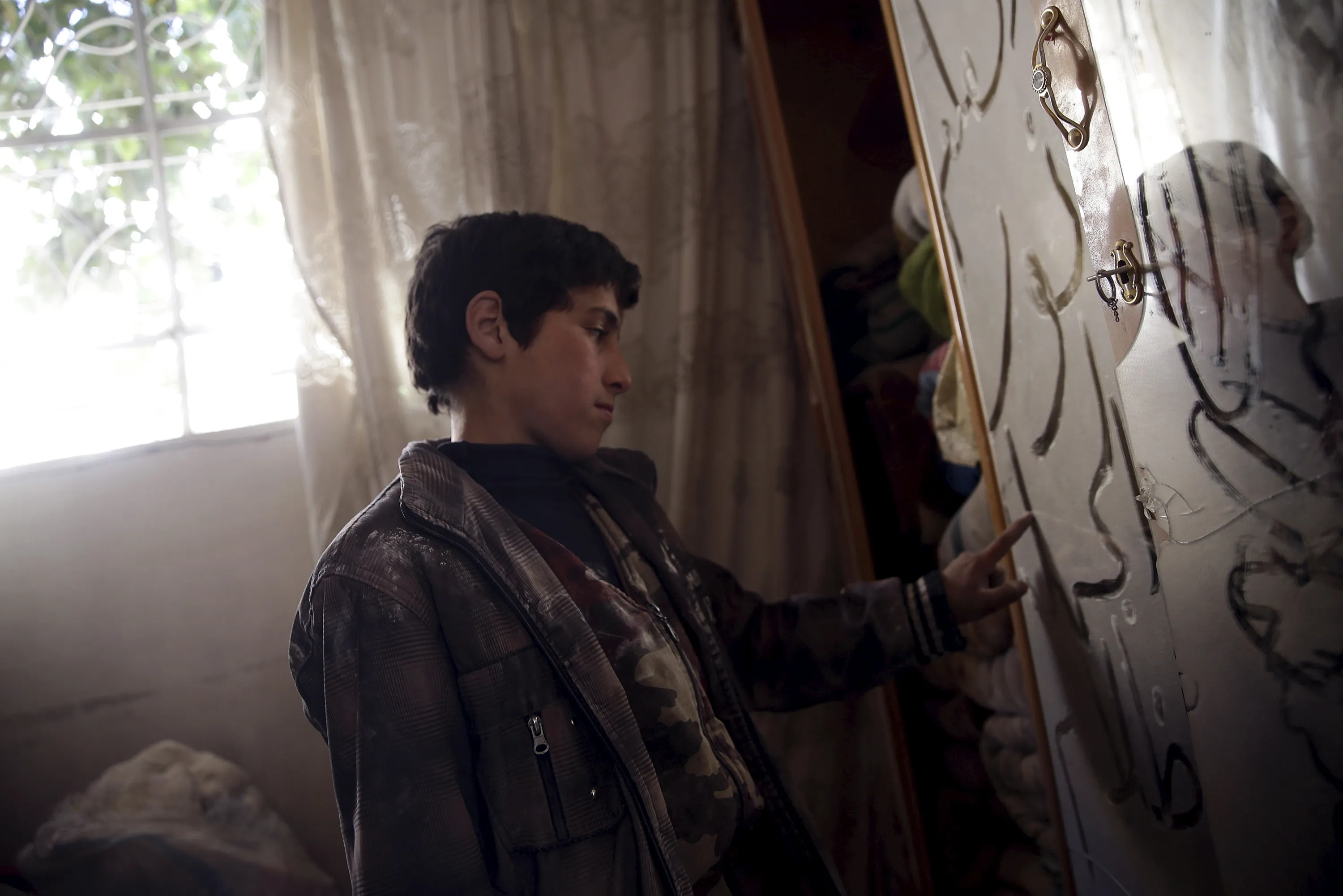 A boy writes on a dusty mirror in a damaged house in the rebel held besieged city of Douma, a suburb of Damascus, Syria February 27, 2016. (Photo by Bassam Khabieh/Reuters)