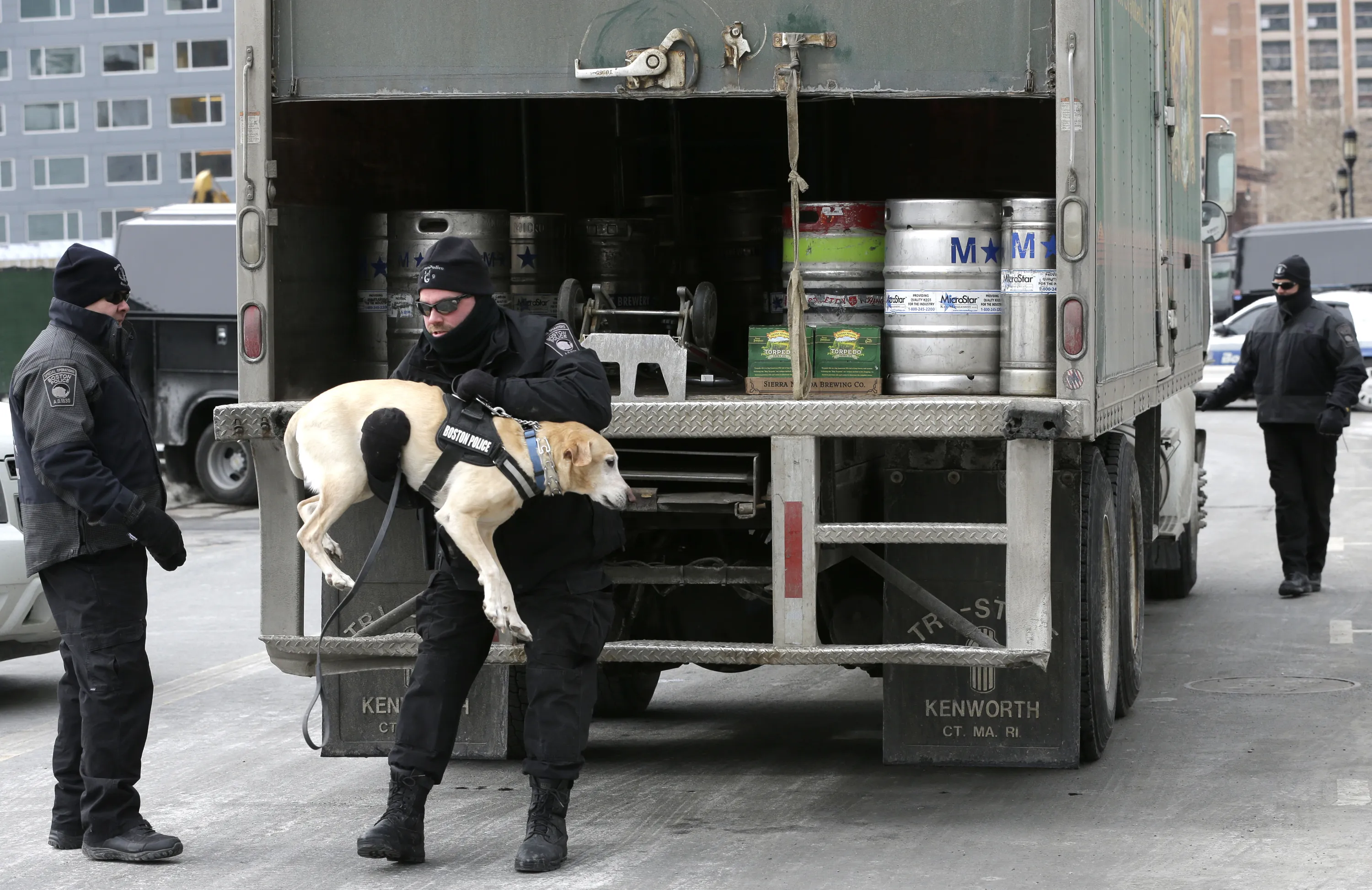 Boston Police Special Operations officers use a bomb-sniffing dog while searching a vehicle on a street near the federal courthouse, in Boston, Tuesday, March 3, 2015. A panel of 12 jurors and six alternates was seated Tuesday after two months of jury selection for the federal death penalty trial of Boston Marathon bombing suspect Dzhokhar Tsarnaev. (Photo by Steven Senne/AP Photo)