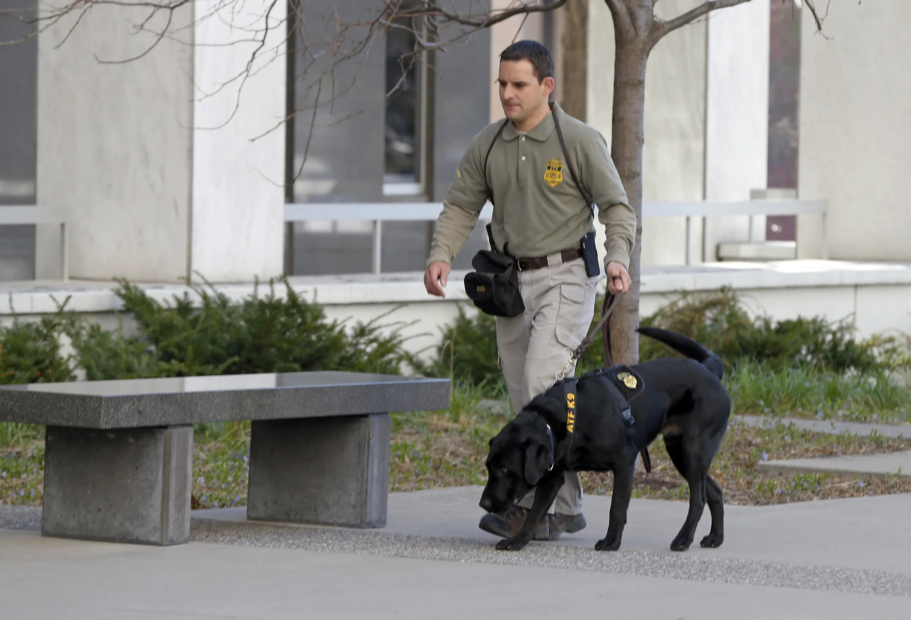 An ATF agent and his bomb-sniffing dog patrols around the Warren E. Burger Federal Building where a detention hearing was being held Thursday, April 23, 2015, in federal court in St. Paul, Minn. for four of the six Minnesotans who are accused of plotting to travel to Syria to join the Islamic State group. Prosecutors have said they plan to ask a judge to keep the men in custody pending trial, saying they are a flight risk. (Photo by Jim Mone/AP Photo)