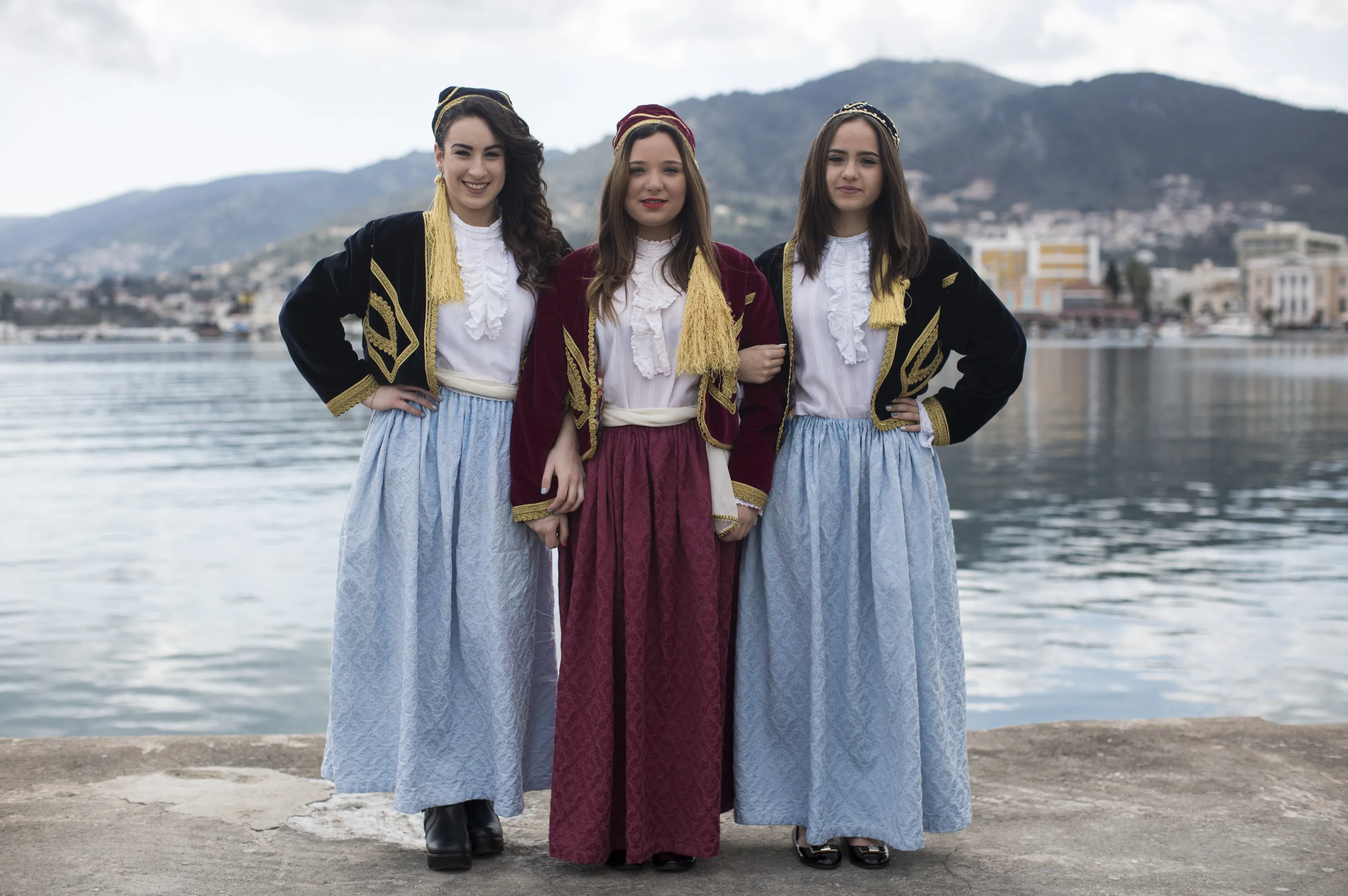 School children wearing traditional island dress pose as they wait for the Independence Day parade on March 25, 2016 in Mytilene, Greece. The annual parade marks the anniversary of Greek independence from Turkish rule in 1821, and is attended my School children from across the Island and military personnel. (Photo by Dan Kitwood/Getty Images)