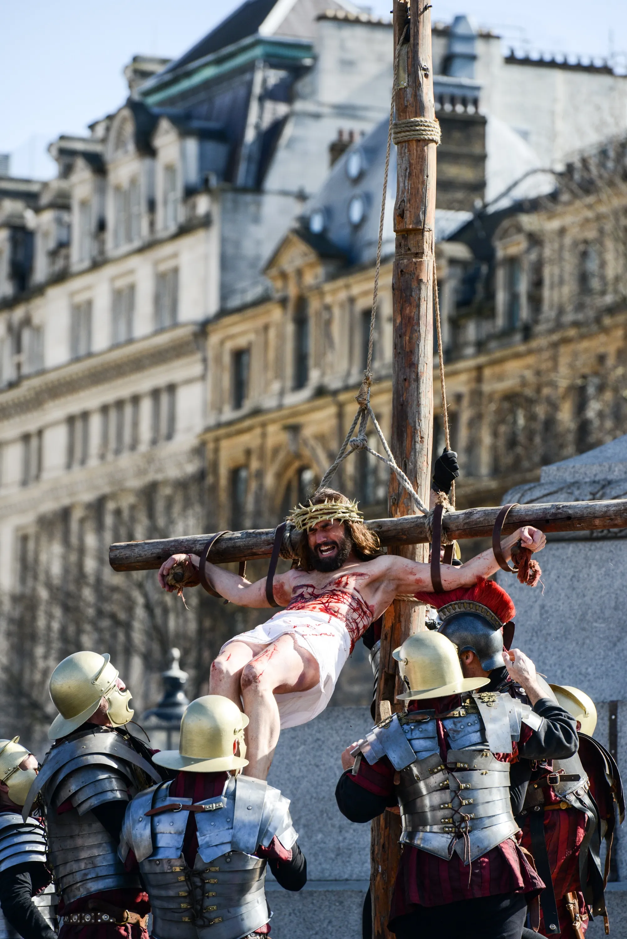 Actor James Burke-Dunsmore is raised on to a crucifix whilst playing Jesus during The Wintershall's “The Passion of Jesus” in front of crowds on Good Friday at Trafalgar Square on March 25, 2016 in London, England. (Photo by Chris Ratcliffe/Getty Images)