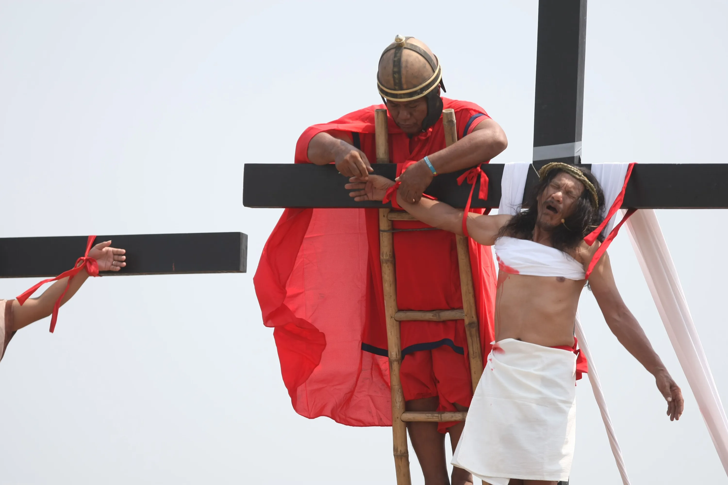 Ruben Enaje is untied and lowered down by a volunteer dressed as a Centurion after he was nailed to a wooden cross during a reenactment during Good Friday rituals on Friday, March 25, 2016 at Cutud, Pampanga province, northern Philippines. (Photo by Linus Escandor II/AP Photo)