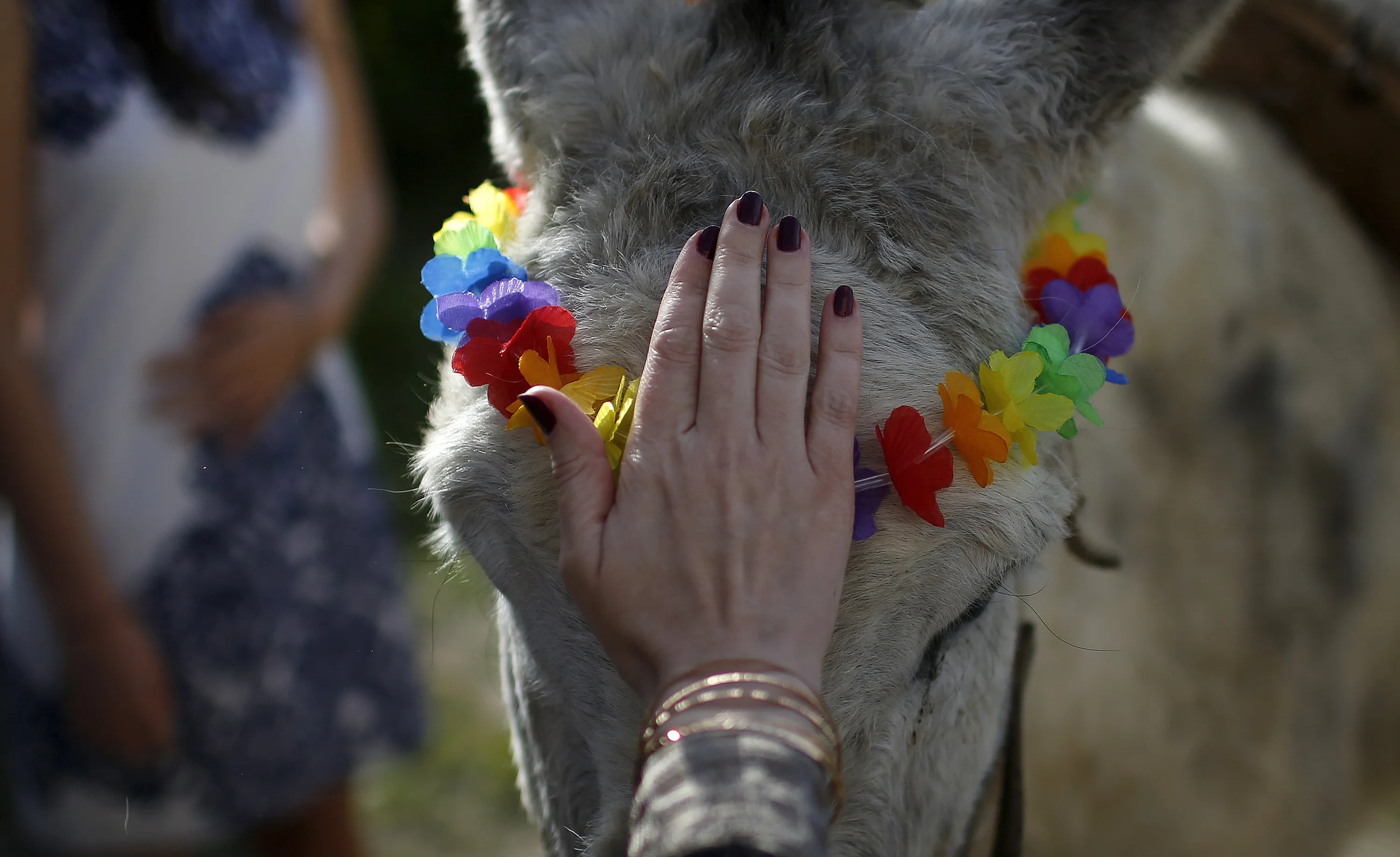 A donkey is stroked by a women before the start of procession of the “Virgem da Atalaia” during Holy Week in Alcochete, near Lisbon, Portugal March 27, 2016. (Photo by Rafael Marchante/Reuters)
