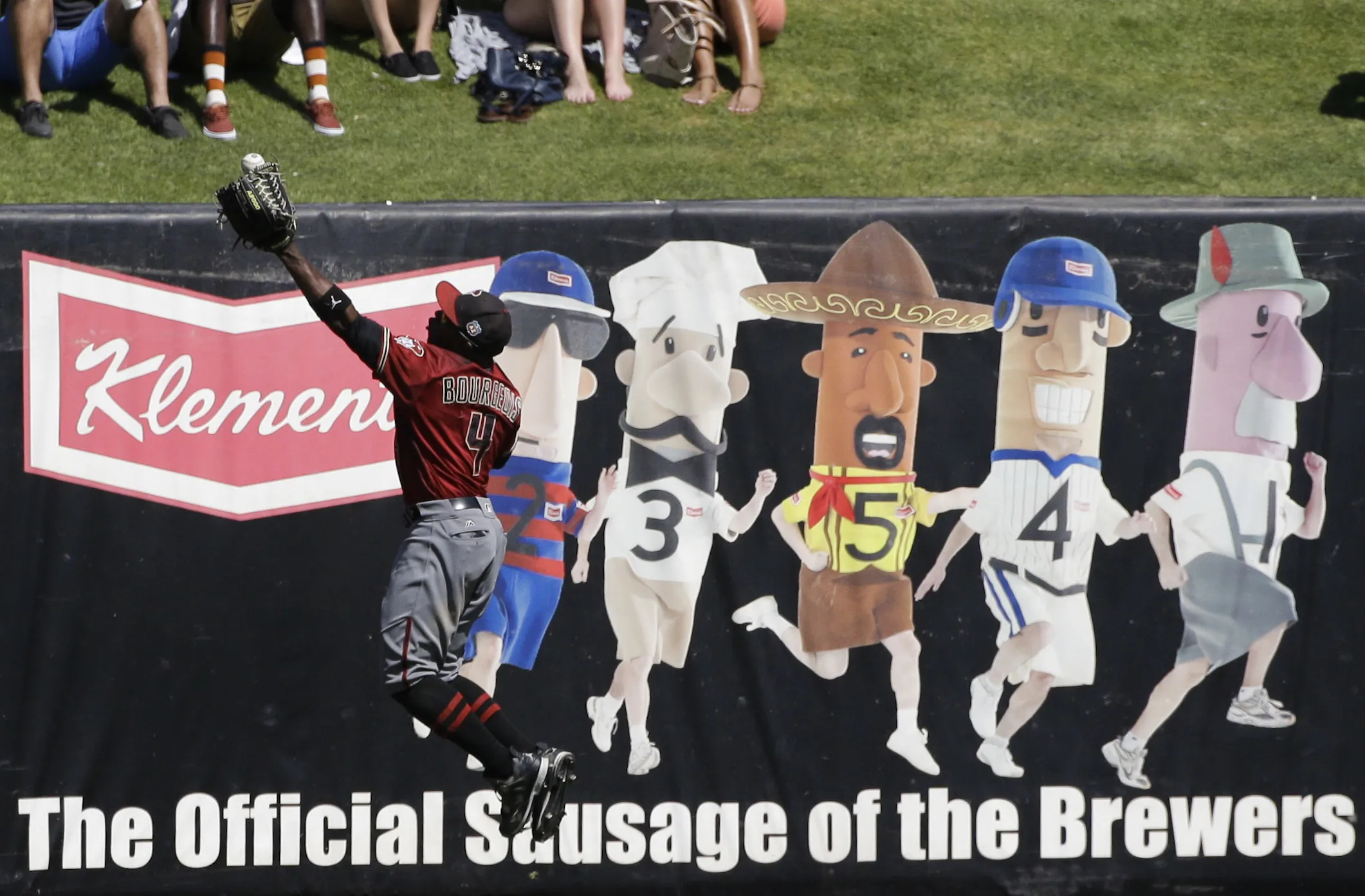 Arizona Diamondbacks' Jason Bourgeois fields a double hit by Milwaukee Brewers' Colin Walsh during the fifth inning of a spring training baseball game Saturday, March 26, 2016, in Phoenix. (Photo by Jae C. Hong/AP Photo)