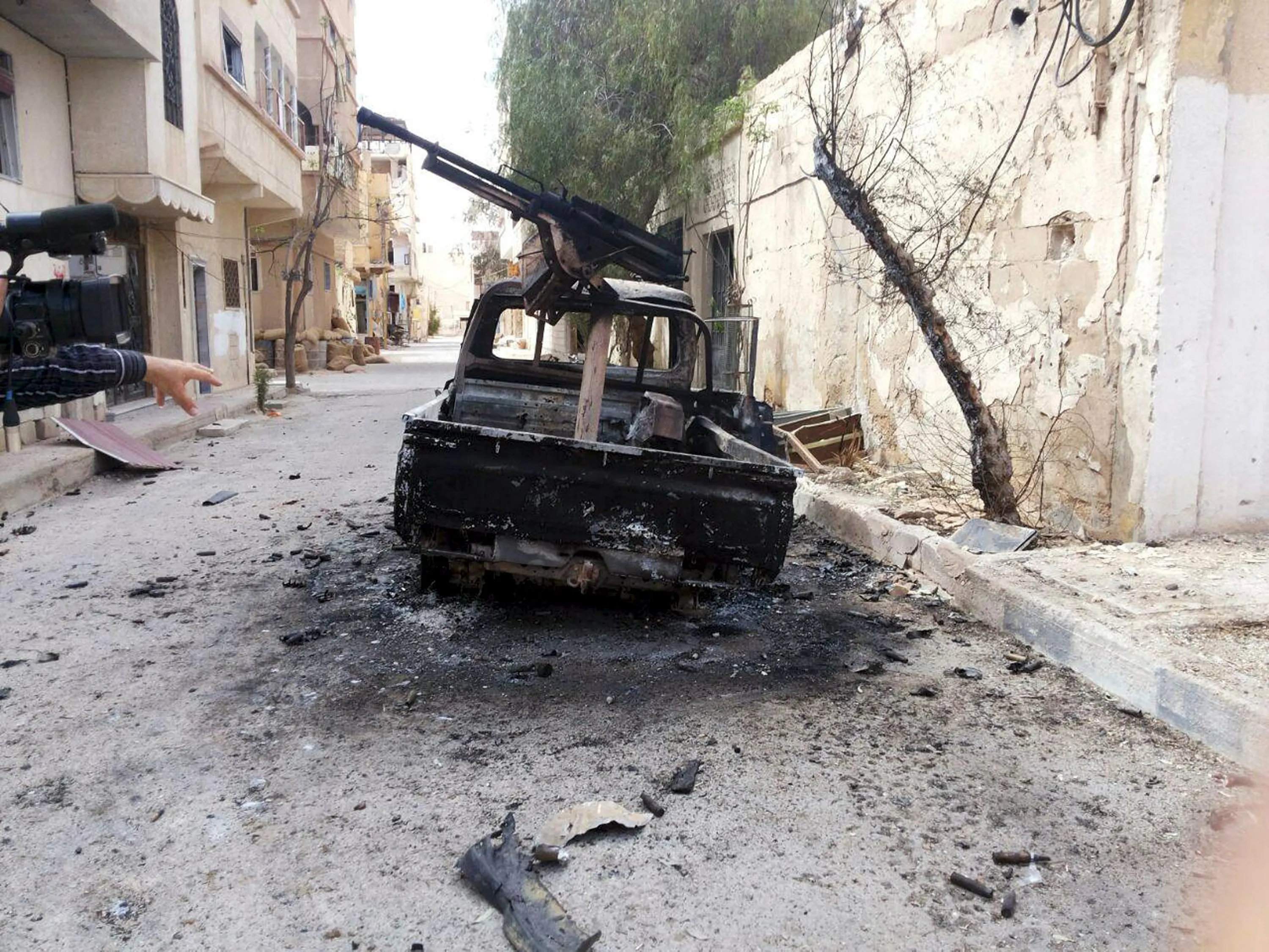 A burnt military vehicle is seen in Palmyra city after forces loyal to Syria's President Bashar al-Assad recaptured it, in Homs Governorate in this handout picture provided by SANA on March 27, 2016. (Photo by Reuters/SANA)