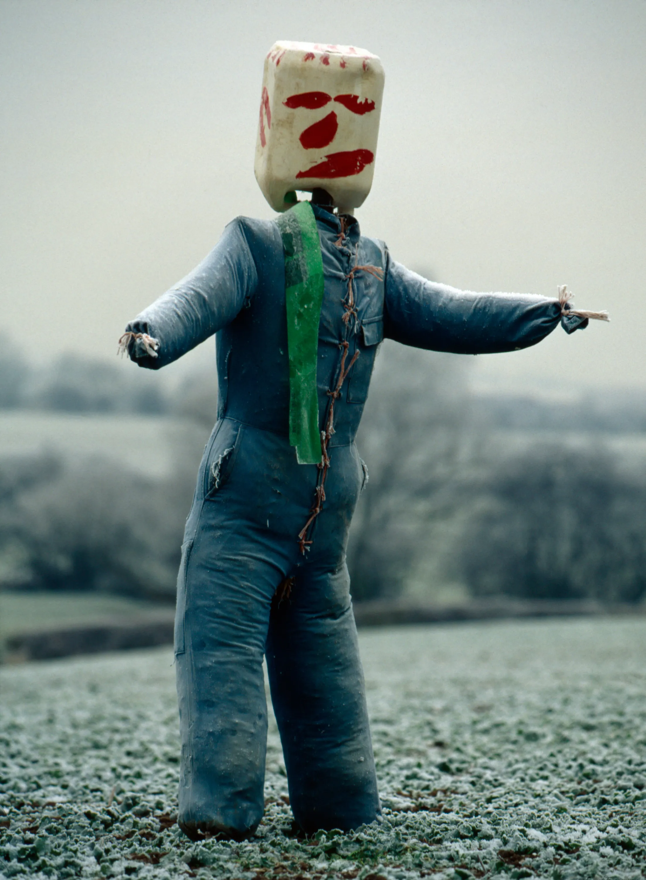 “One significant aspect of the evolution of scarecrows is the use of plastic containers, along with other modern materials such as masks and boiler suits. This one was pictured in Braybrooke, Market Harborough”. (Photo by Colin Garratt)