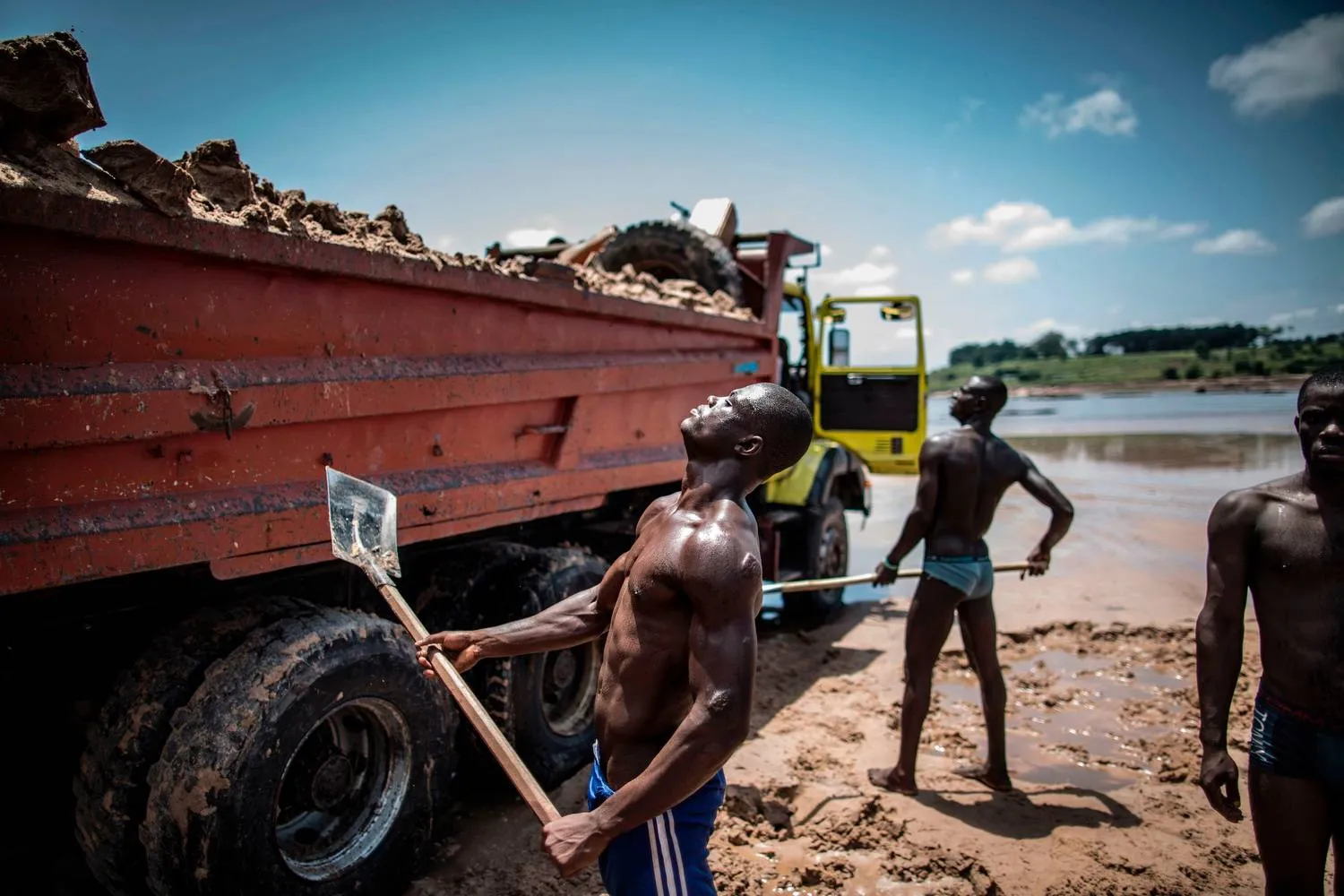 Sand diggers are seen loading trucks at a quarry on the banks of the Congo river in the Kombe district of Brazzaville on March 28, 2016. (Photo by Marco Longari/AFP Photo)