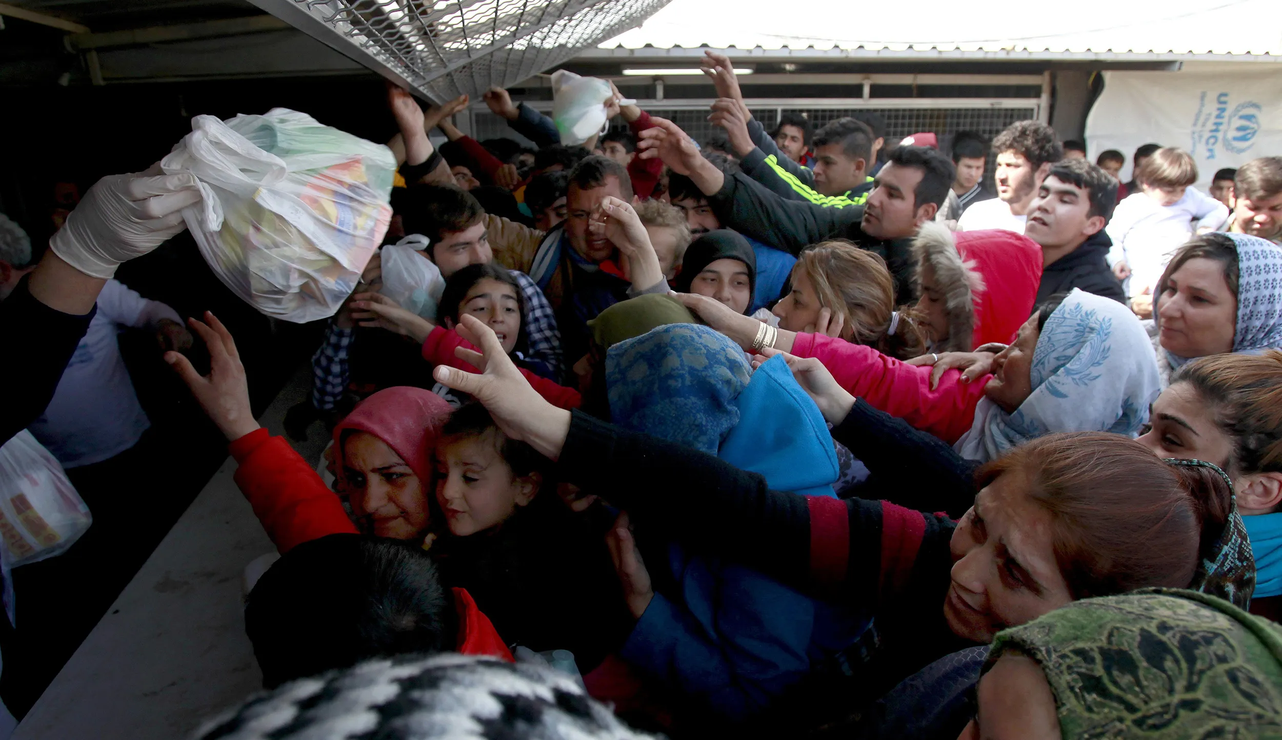 Refugees and migrants reach for food packages provided by humanitarian workers, at the transit center for refugees near northern Macedonian village of Tabanovce on the border with Serbia, Monday, March 28, 2016. (Photo by Boris Grdanoski/AP Photo)