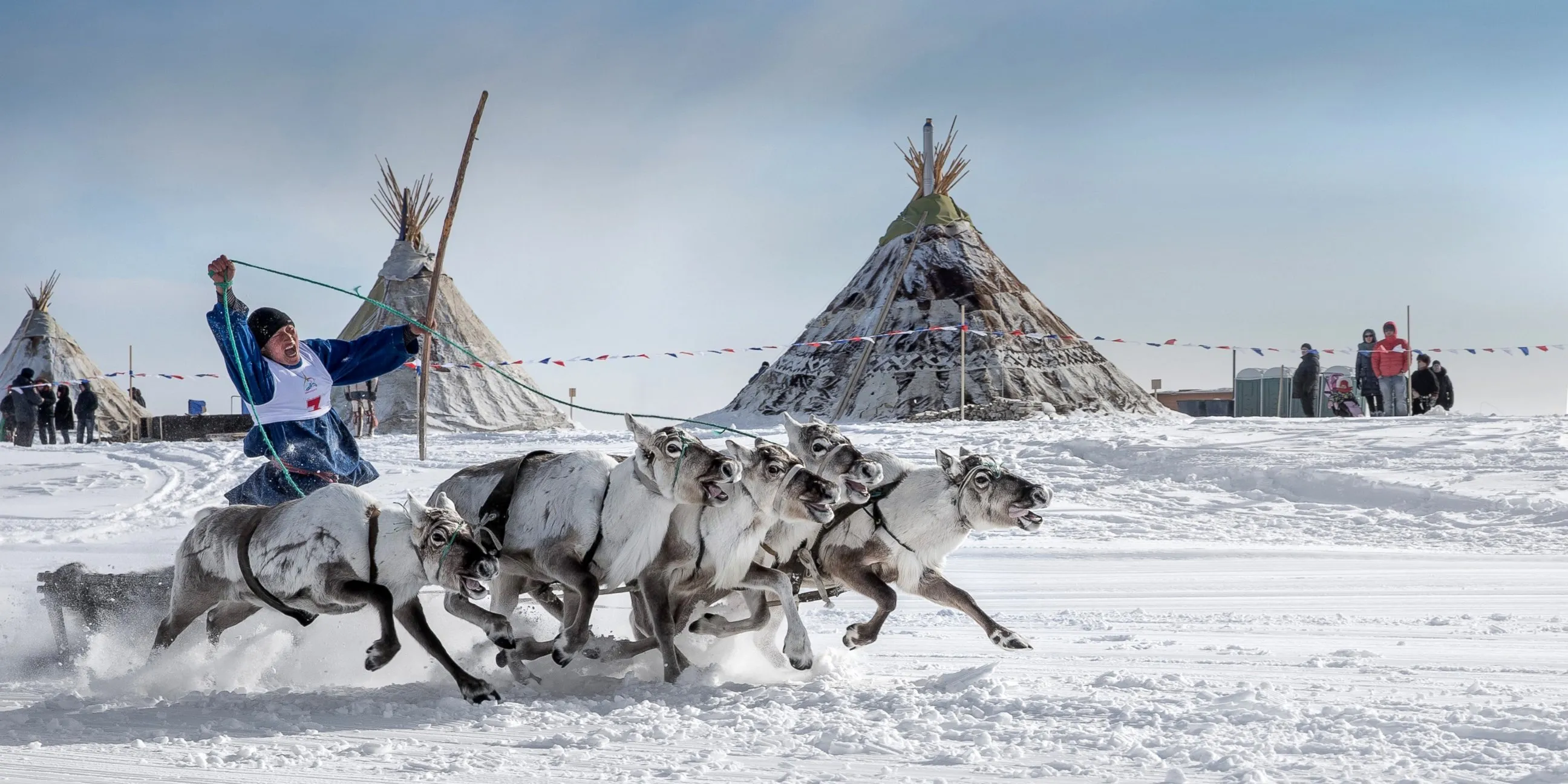 A Nenets rides a sled during a reindeer race on the Reindeer Herders' Day in Nadym, near Moscow, Russia, March 28, 2016. For the indigenous nomadic Nenets people, Reindeer Herders' Day offers a chance to show their prowess in wrestling, high jumps and other traditional local sports in reindeer races. (Photo by Sergey Anisimov/Getty Images/Anadolu Agency)
