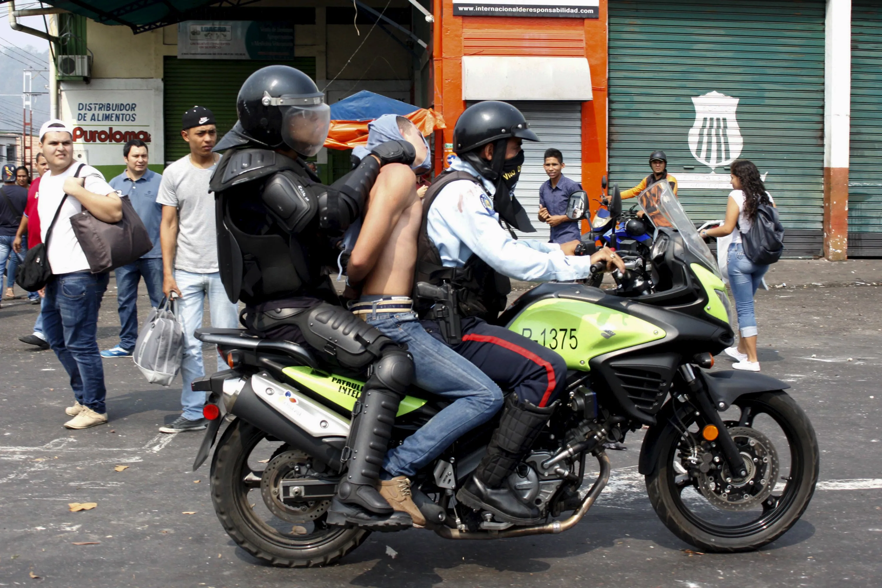 Police officers detain a demonstrator (C) on a motorcycle during a protest against the increase in the price of public transport in San Cristobal March 29, 2016. (Photo by Carlos Eduardo Ramirez/Reuters)
