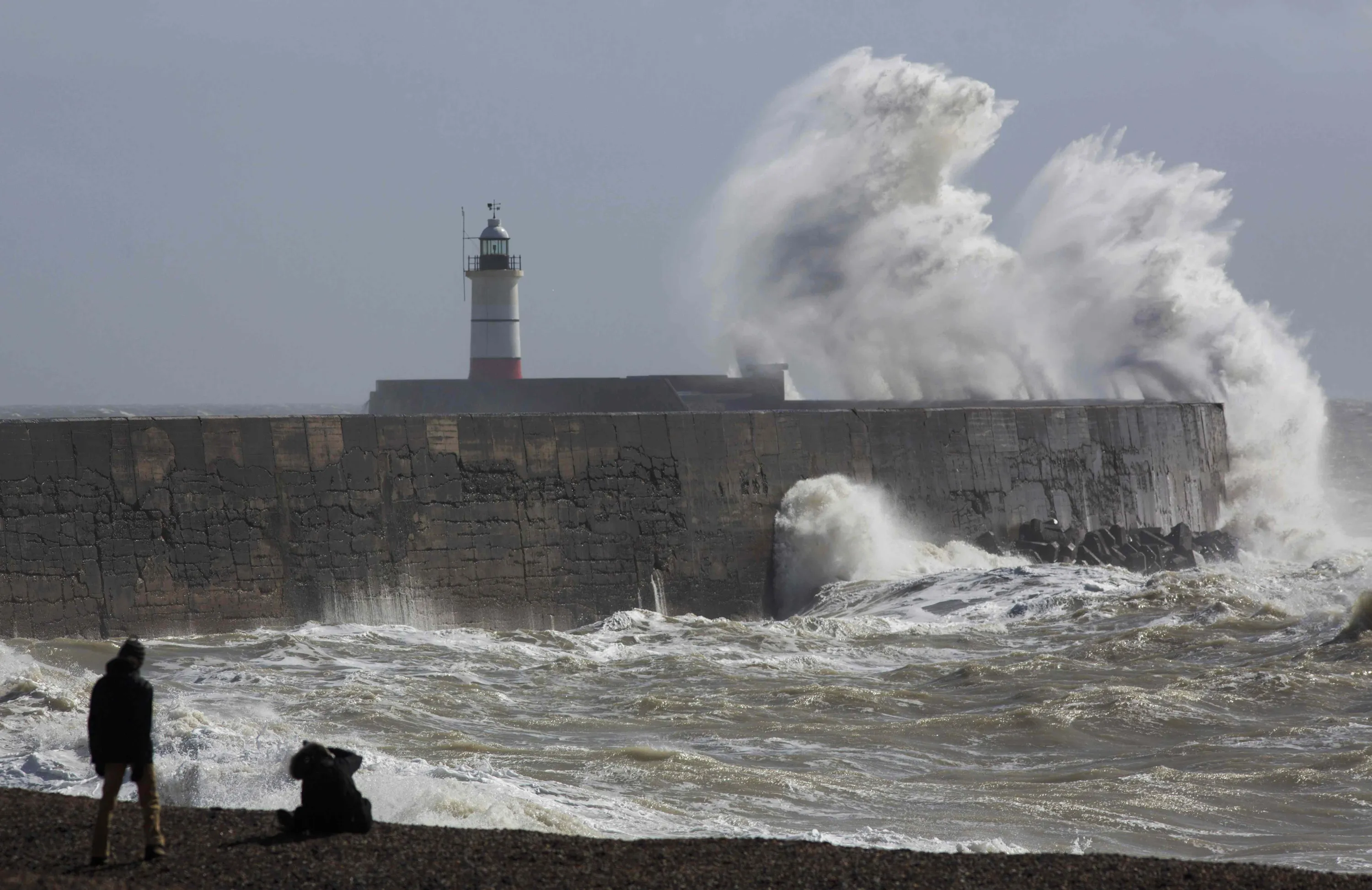 People watch waves crash against the harbour wall at Newhaven in southern Britain March 28, 2016. (Photo by Neil Hall/Reuters)