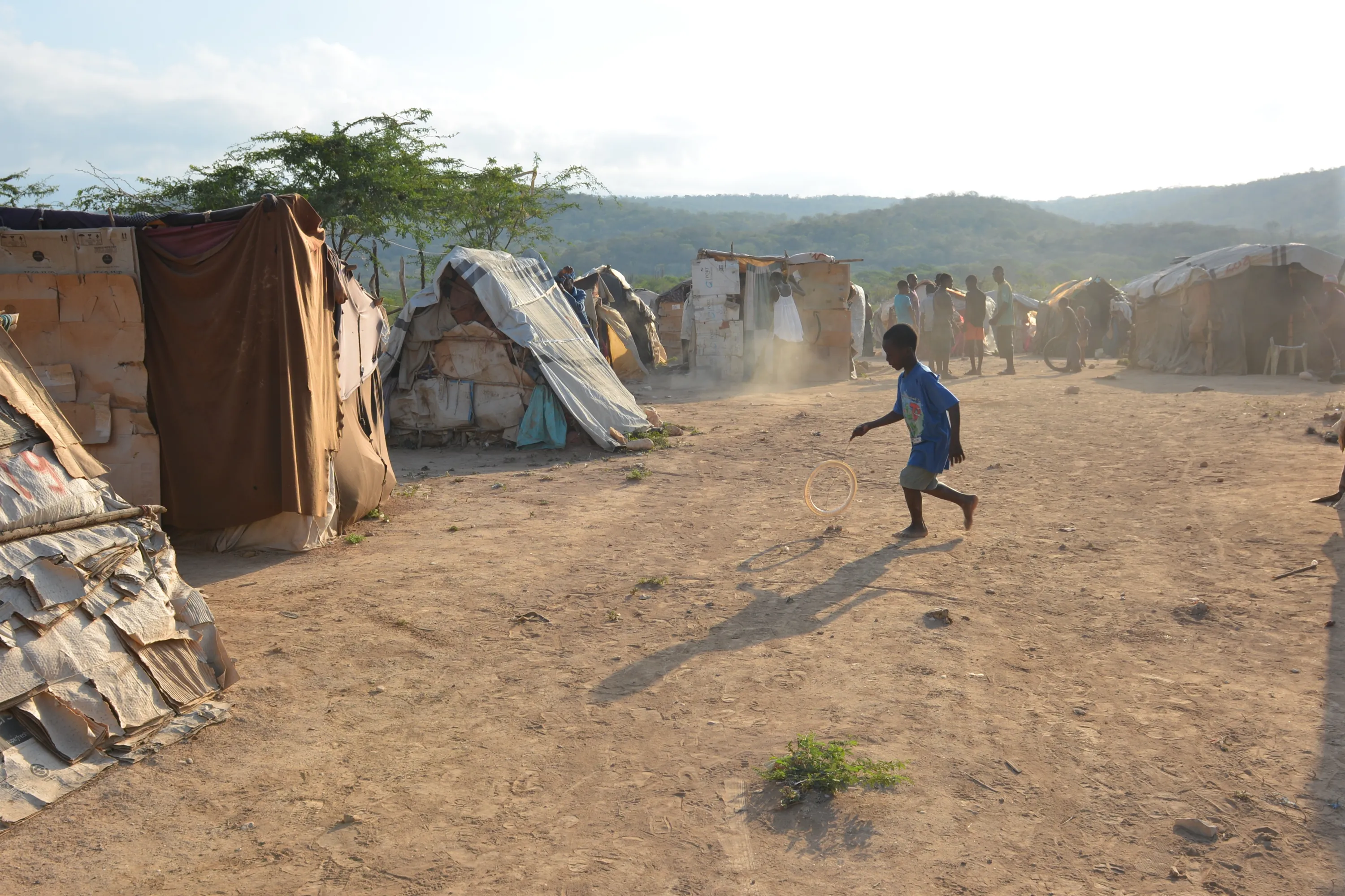 In this March 22, 2015 photo, a boy plays with a discarded tire at a borderland encampment outside the southeast Haitian town of Anse-a-Pitres, Haiti. (Photo by David McFadden/AP Photo)